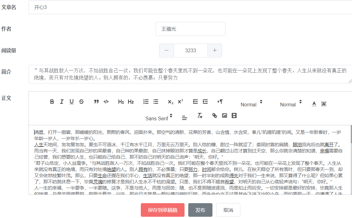 本论文设计了一个基于Spring Boot的学生健康管理系统。这个系统采用Spring Boot框架以及Vue.js前端框架,结合MyBatis和MySQL数据库技术结合开发。该系统的功能包括个人信息管理、个人健康体检信息管理、健康读物管理、角色管理、学生健康信息管理、角色分配、权限分配等功能,系统简介易操作,使用者很容易进行操作。