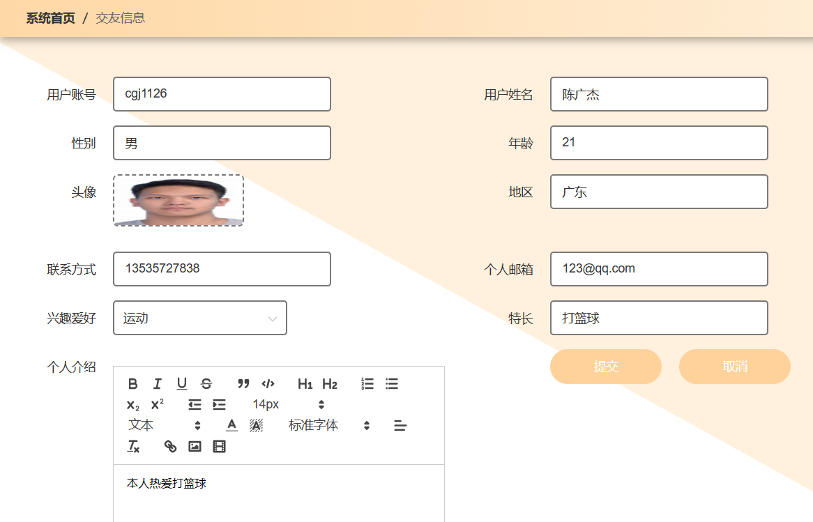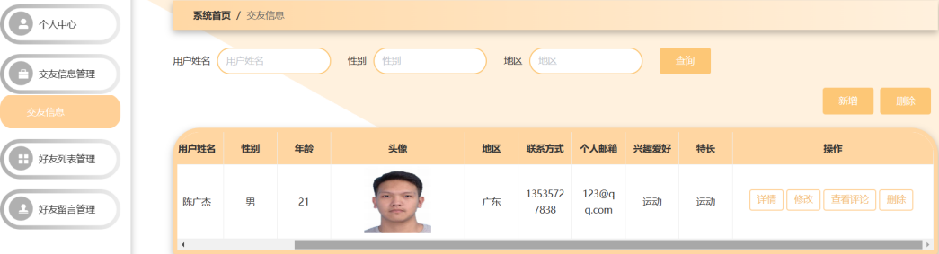 随着互联网时代的到来,越来越多的人认识新朋友的方式都逐渐在变化,以往的交友,存在一定的局限性,而线上交友成为了新的交友趋势,通过互联网平台进行虚拟社交,可以与其他用户交流和互动,为人们提供了一种方便的方式来扩大自己的社交圈子或寻找新的朋友和合作伙伴。本论文拟开发一个在线交友系统,采用Spring Boot框架和Vue.js框架来搭建整个项目,系统主要分为用户端和管理员端,用户端主要设计了交友信息模块,近期活动模块,交友广场模块,后台管理模块等模块功能。管理员端主要设计了交友信息管理模块,用户管理模块,交友广场管理模块,好友留言管理模块,好友列表管理模块,网站公告管理模块等模块功能,通过在线交友系统,用户可以更方便、更精准地寻找自己的新朋友。
