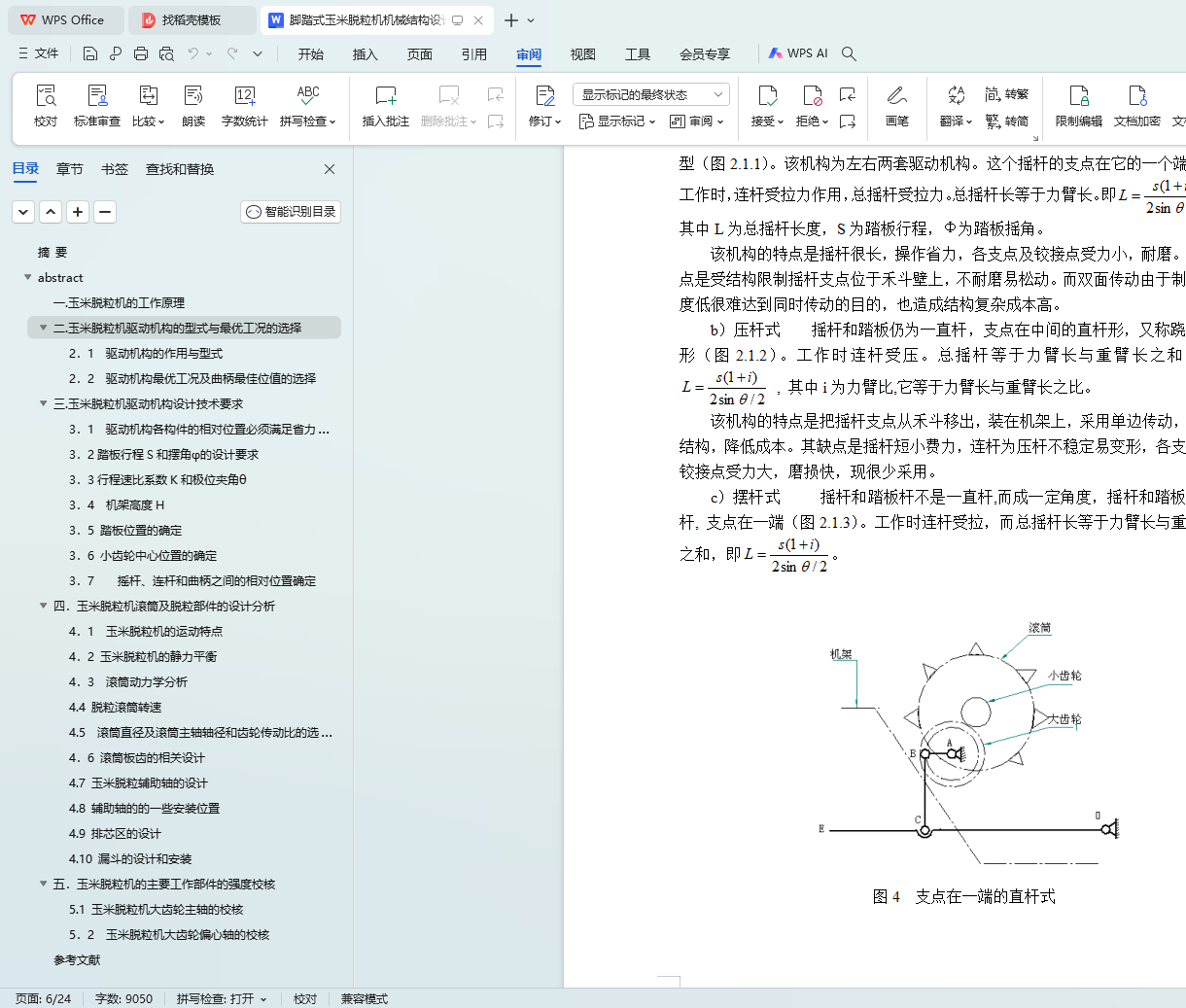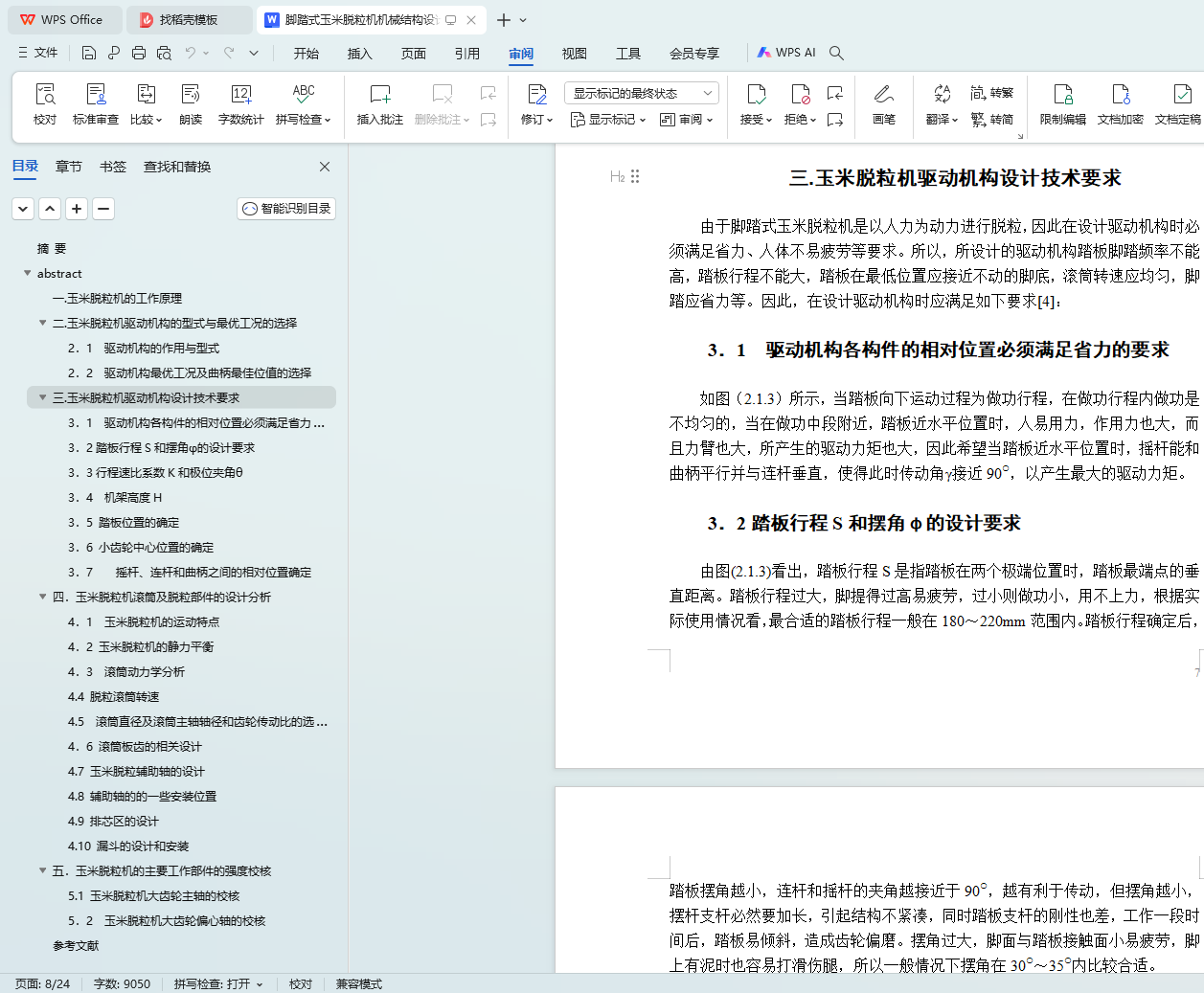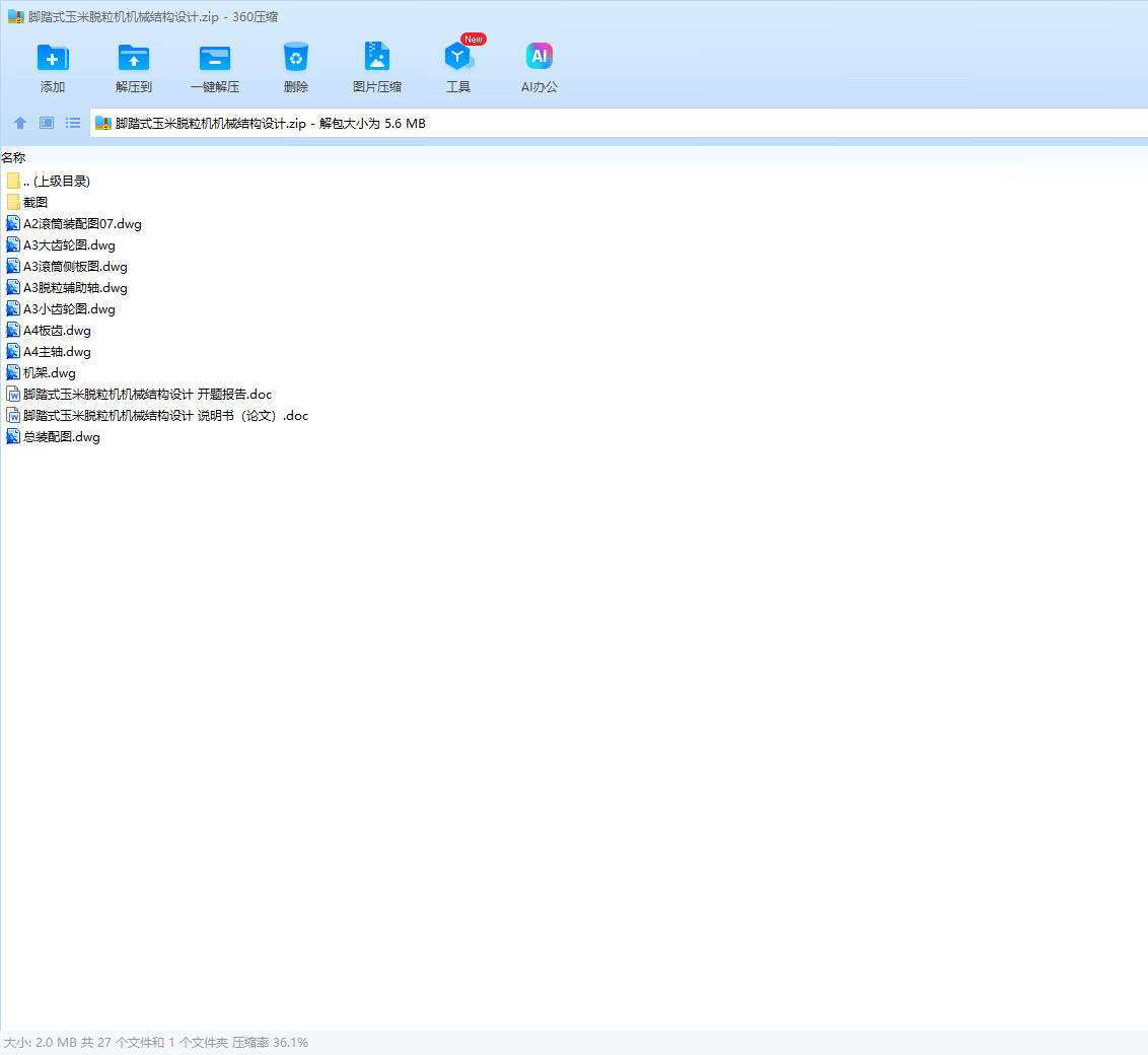 本次设计玉米脱粒机工作原理就是利用板齿和脱粒辅助轴之间的相互挤搓实现脱粒,板齿安装在滚筒上,滚筒的主轴通过曲柄连杆机构和脚踏板相连。脱粒辅助轴是用于抵住玉米棒,并利于玉米棒在板齿和辅助轴之间滚动和滑动,从而实现脱粒。本设计重点是曲柄连杆机构的设计,以达到最优工况;滚筒、主轴、板齿和脱粒辅助轴的设计,还有排芯区和喂料装置――漏斗的设计。