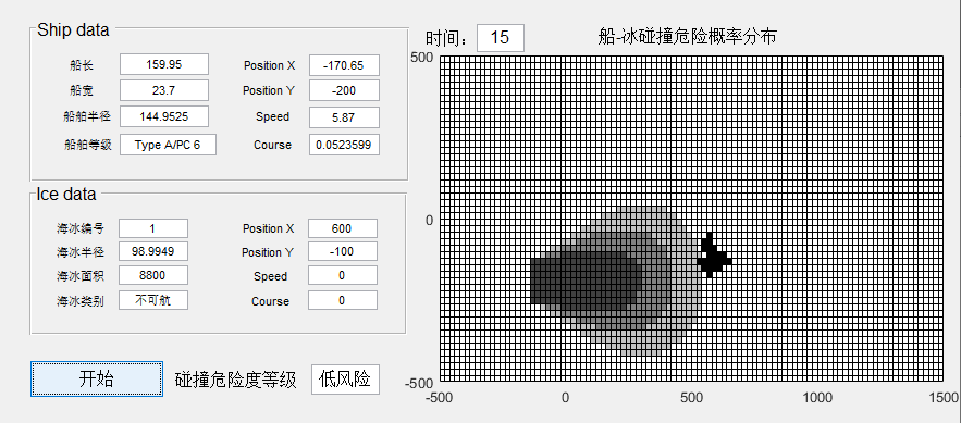 (3) Multi-stage decision-making method for ship-ice collision avoidance. Aiming at the problem of different perspectives between ship-based sea ice semantic image and ship plane, the sea ice pixels in semantic image are mapped to the ship's world space coordinate system after inverse perspective transformation according to the geometric relationship of ship-based camera in oblique imaging condition. Then the rasterization process is performed to unify the ship-ice space-time coordinate system, and further realize the analysis of sea ice parameters and the construction of the ship-ice collision physical model. On this basis, combined with the probability model of ship's own motion state, the risk analysis method of ship ice collision based on kunzi model is adopted, and the risk threshold of ship ice collision is set to realize the dynamic early warning of dangerous sea ice, and then the collision state is analyzed according to the collision risk degree, and the effective collision avoidance strategy is formulated. Finally, the above method is used to simulate the collision risk judgment and collision avoidance decision-making process under two typical ship ice collision situations.