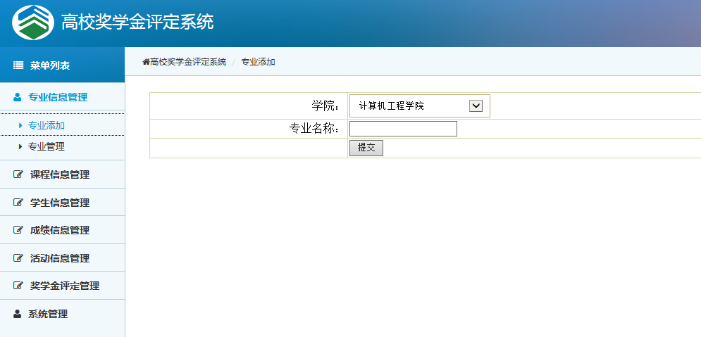 高校奖学金评定系统的设计与实现是基于网页模式B/S架构的。系统主要包括了专业信息管理、学生信息管理、课程信息管理、成绩信息管理、活动信息管理、奖学金评定管理。系统通过在浏览器中输入登录地址,登录成功后即可操作本系统。