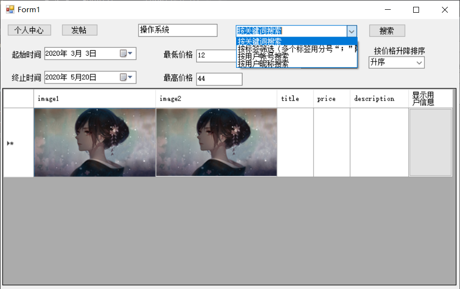 做一款校内自由物品供需交易平台,属于winForm桌面应用程序。用户随时都能在上面寻找自己想要的东西和发布想要获得或出售的物品。找到后可以查看目标用户的个人信息,包括联系方式和现居住地址。然后,用户自行用QQ或微信进行交流。