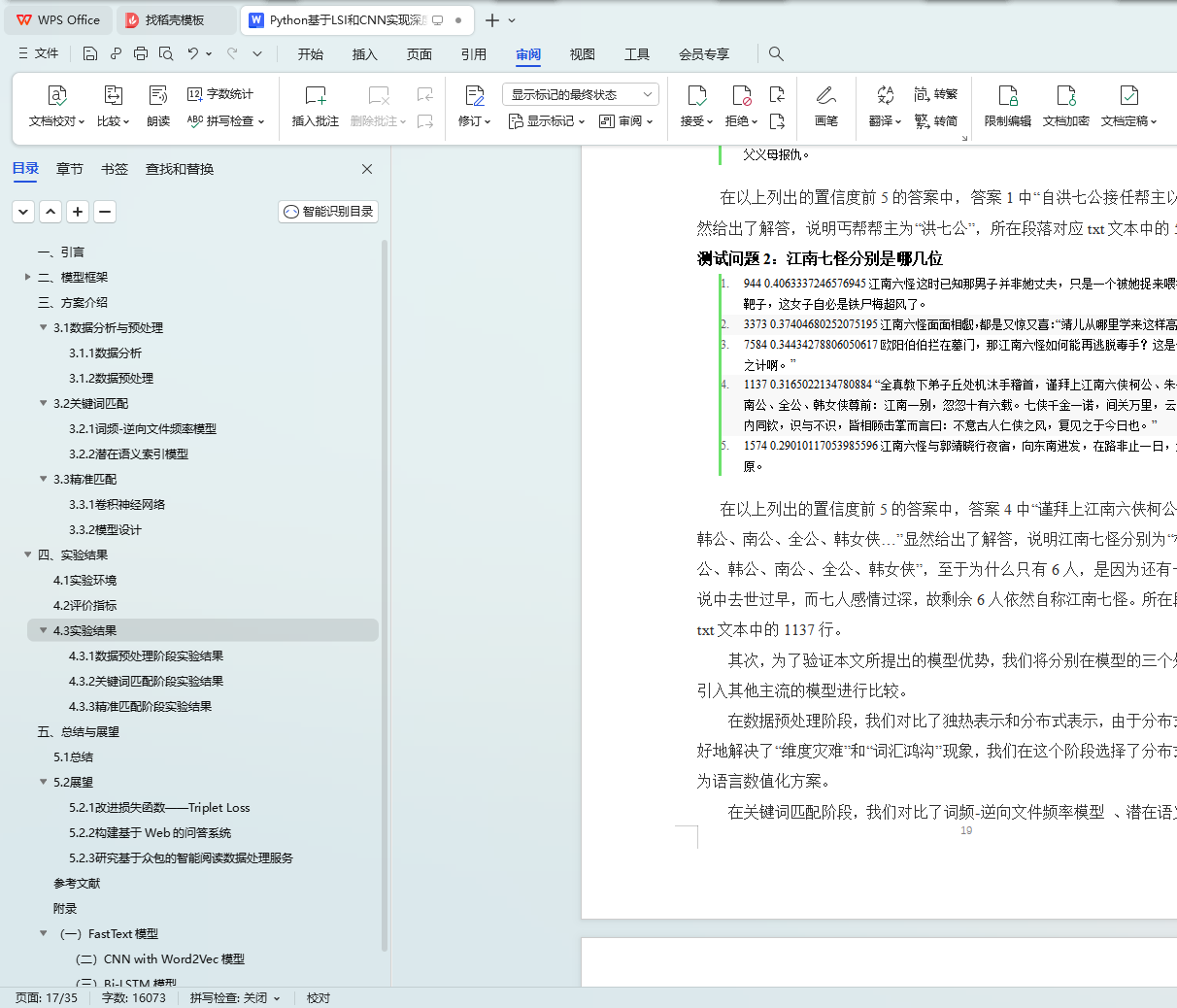 第二步选取经典文本“射雕英雄传”进行实验,通过使用词频-逆文件频率(TF-IDF)模型以及基于奇异值矩阵分解(SVD)的潜在语义索引模型(LSI)进行关键词匹配,得出较佳答案。