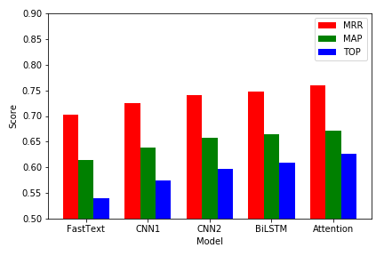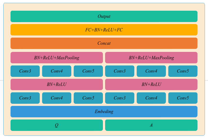 第三步根据经典的文本分类卷积神经网络模型,我们设计了一个更深更复杂的卷积神经网络模型。通过词嵌入后,分别对问题和关键词匹配结果中的回答进行两次卷积核大小为3、4、5的卷积操作,经过最大池化层后,将池化的向量连接起来。并通过使用 ReLU 激活函数,防止反向传播过程中的梯度问题(梯度消失和梯度爆炸)以及使用 Batch Normalization 批规范化,加速收敛,最终选取置信度前15的答案作为候选答案。随后计算得到准确率为77.0492%, F1-score为0.5767,以此来评价模型的优劣,并设计测试用例查看模型运行结果。
