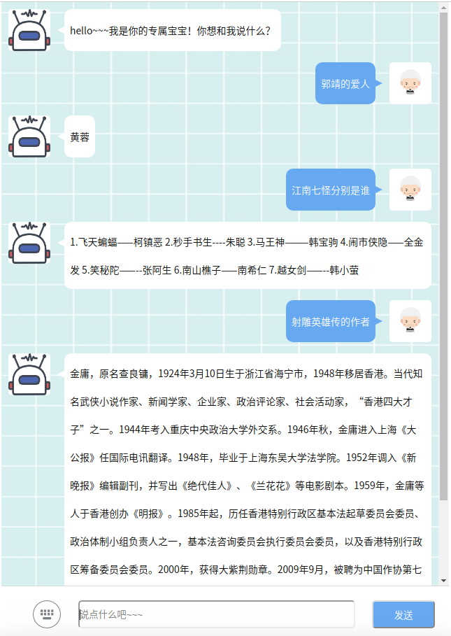 In the second step, the classical text “Legends of the Condor Heroes” was chosen to conduct experiments. The key words were matched by using the word frequency-inverse document frequency(TF-IDF) model and the latent semantic index(LSI) model based on singular value matrix decomposition to obtain a better answer.