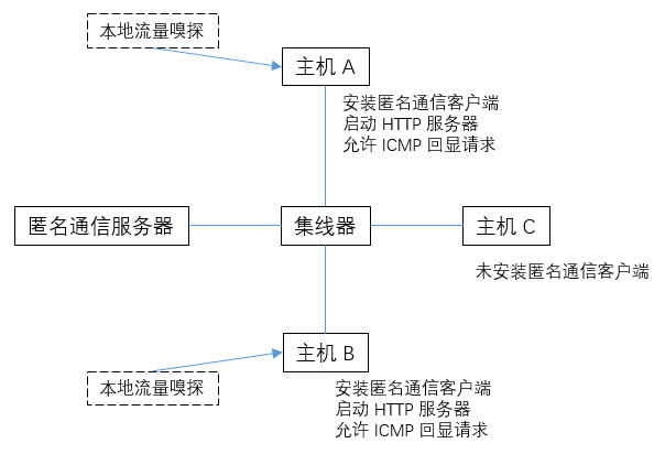 目前许多企业网络面临着流量嗅探的安全威胁。不法分子通过技术手段,拦截、分析网络中的流量。为了防止恶意流量嗅探,可以使用匿名通信技术,将流量中的 MAC 地址、IP 地址、TCP/UDP 端口号进行伪造。匿名通信系统要求在主机上部署匿名通信客户端,用于实现匿名通信协议,同时防止本地恶意软件进行原始流量嗅探。