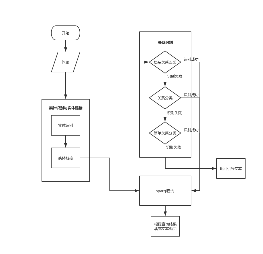 当用户输入一个句子之后,问答系统会从用户的句子中抽取对应的实体提及,然后根据抽取的实体提及通过实体链接映射到知识图谱中的实体。同时,系统也会从句子中识别到用户想要问的关系,然后结合实体和关系,即可使用sparql语言从知识图谱中查询得到对应的结果。