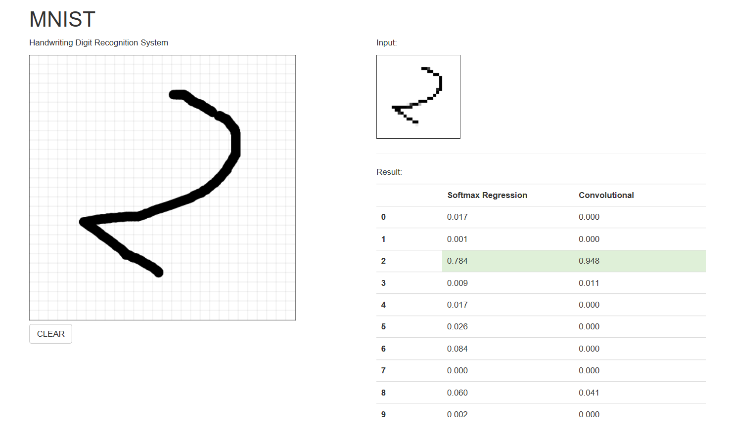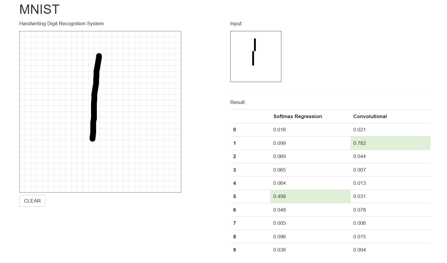 This paper aims to build a Softmax regression model and a convolutional neural network model by using the Tensorflow artificial intelligence framework developed by Google, and compare the recognition rates of both model. The handwritten digital dataset used in this topic is the MNIST dataset. The dataset is divided into three parts: 55,000 rows of training datasets, 10,000 rows of test datasets, and 5000 rows of validation datasets. The length and width of the image for each test set are each 28 pixels, and the label of the test set indicates which number the image is. After constructin、training and applying those models, the recognition rates of handwritten numbers by Softmax regression model and convolutional neural network model are 91.92% and 99.13%, respectively. The recognition rate of convolutional neural network has reached the level of practical application. This paper provides a certain theoretical value and scientific research basis for the development of artificial intelligence handwritten digit recognition.