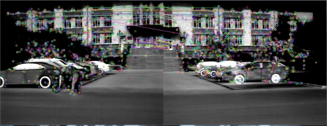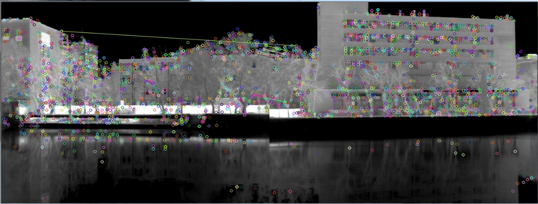 本文的课题背景是横向分布的左右红外相机的实时拼接,对拼接的实时性提出了更高的要求。现阶段应用广泛的基于特征点图像拼接算法有基于SIFT(Scale Invariant Feature Transform)特征、SURF(Speeded Up Robust Features)特征。传统的SIFT算法能够提取更多的特征点,匹配精度高,但是特征提取和匹配是运算复杂,时间空间复杂度高。经测试,SURF特征检测虽然速度快但对于课题的低重叠度图像并不适用,综上所述,本文拟采用基于SIFT特征检测算法的进行图像拼接。虽然课题背景是左右相机的图像拼接,但在实际测试中涉及的是一组离线的静态图片,所有的算法设计路线均是依据静态图像拼接。对于具有固定结构的左右相机图像的拼接,只需要在首帧计算一次变换矩阵即可,大大缩短图像拼接时间,整个过程与静态图像拼接类似。