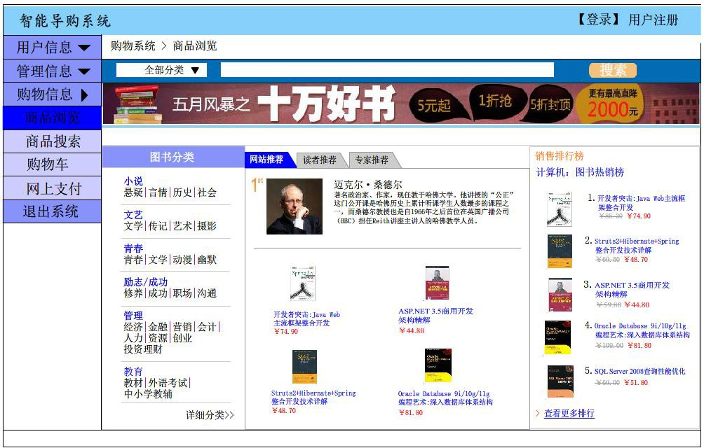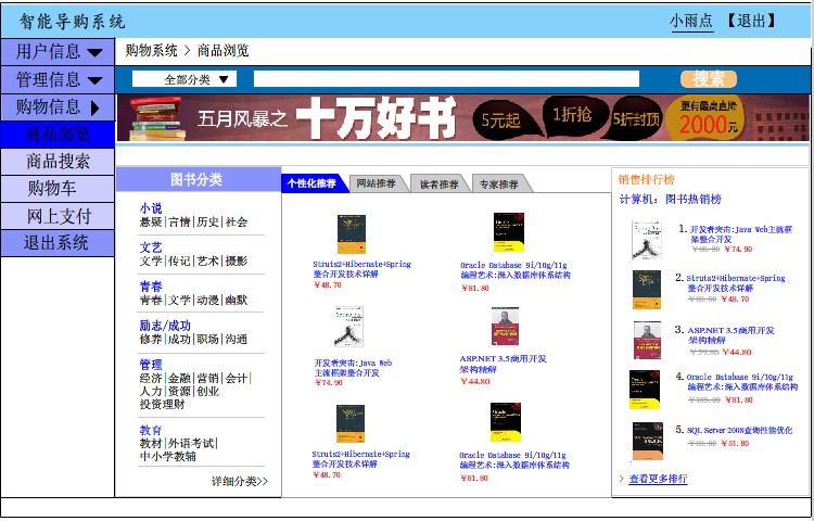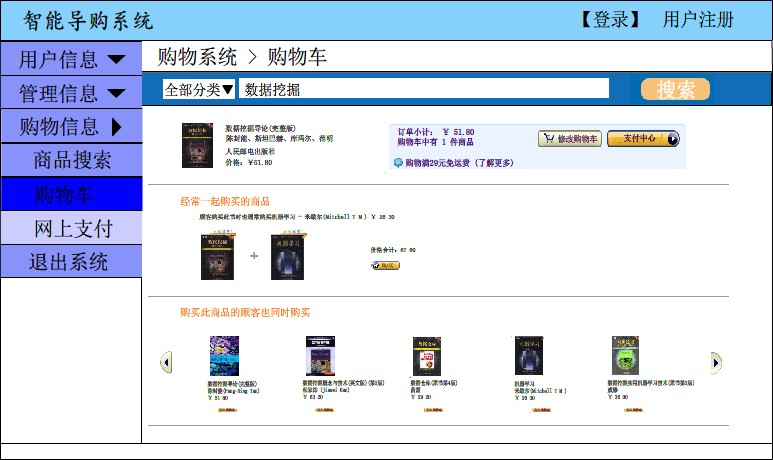 Web 数据挖掘技术,就网上购物系统而言,进一步的研究其可行性、系统设计技术和需求以及实现方法,设计与开发了一个网上购物系统,并将其应用于网上图书的销售。