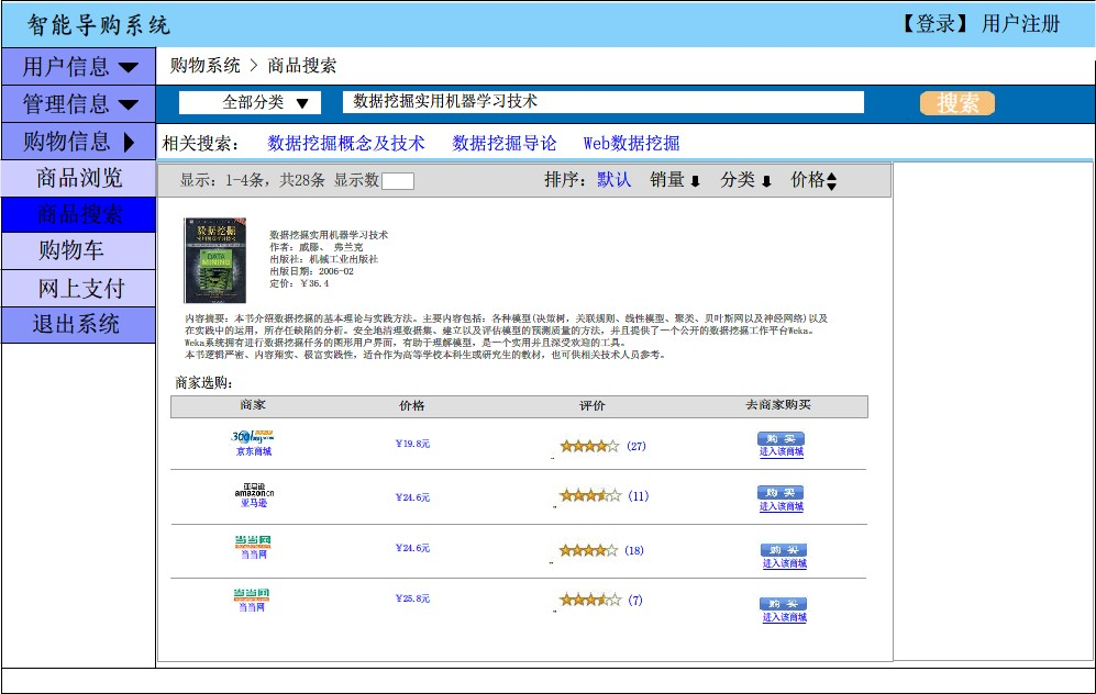 (2)为了解决现有网上商店不统一的问题,为消费者提供一个统一的购物平台,本文设计了一种基于 Web 数据挖掘的智能导购系统。通过该系统用户可以搜寻到各个商家的商品信息,然后进行对比购买。