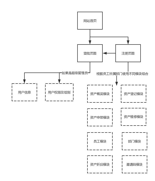 本文以资产管理系统需求为切入点。针对资产,设计了资产登记,领用,折旧以及维修管理等模块。针对应用中的实际需求,设计了权限管理模块,员工和部门管理模块,登录注册模块。并且为了管理方便,增加了邀请码模块,邀请码中包含了权限,有效期,有效次数等信息。