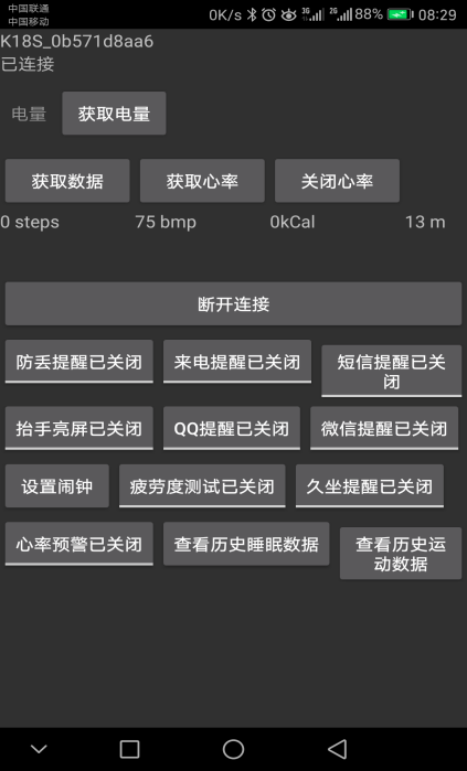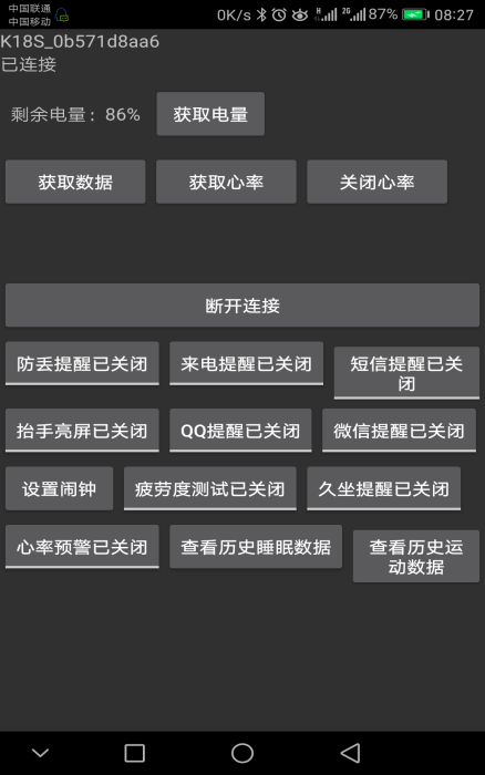 As we all know, a person and then strong, he can not do without social, smart bracelet is the same, although its hardware is very powerful, but it also requires software support.You can only view the data, but if you have a powerful software, you can not only see real-time data, you can also view the historical data, and then to analyze the data, so that the function of this product Become more powerful.Thus, the author based on his own technology, developed a ring product based on the android , the product uses Bluetooth to communicate with smart bracelet. The specific functions of the product are as follows:Access to the bracelet power, access to real-time data (access to the content: the current heart rate, today has been walking, today has gone, today's consumption of calories), hand ring to remind, mobile phone reminder, SMS reminder, QQ Message reminder, WeChat Message reminder, sedentary reminder, heart rate warning, fatigue test, view historical sports data, view historical sleep data (not yet implemented).