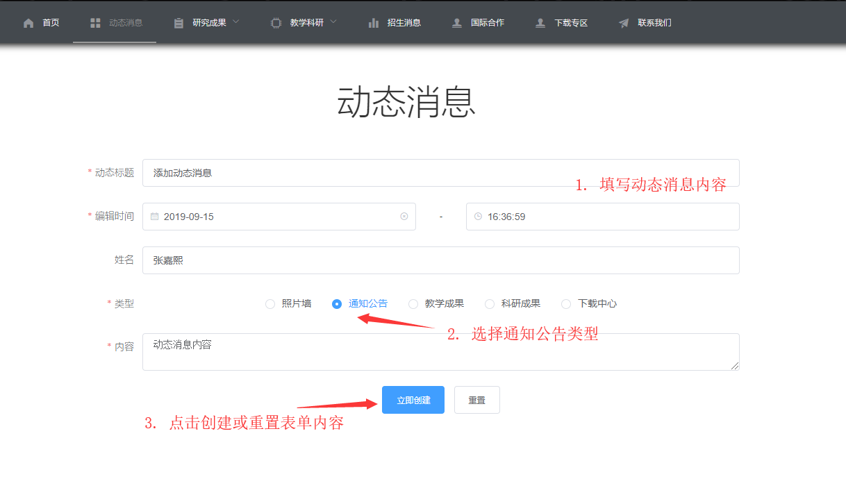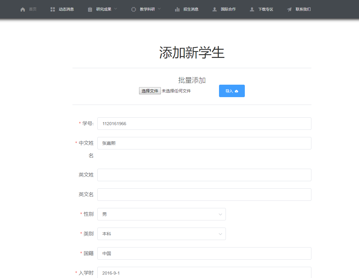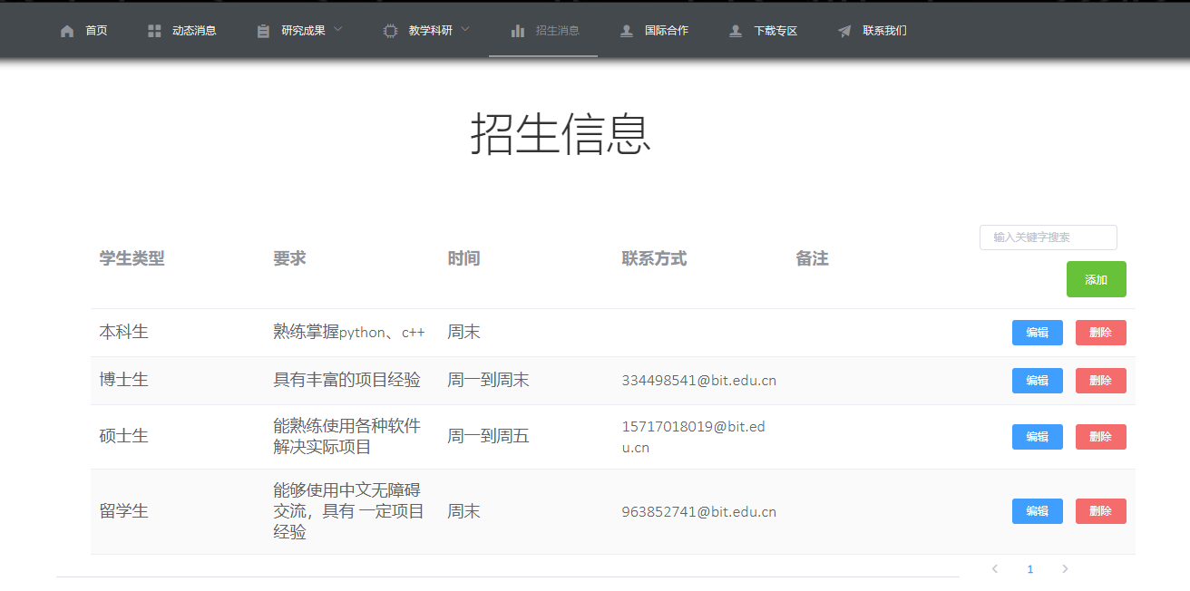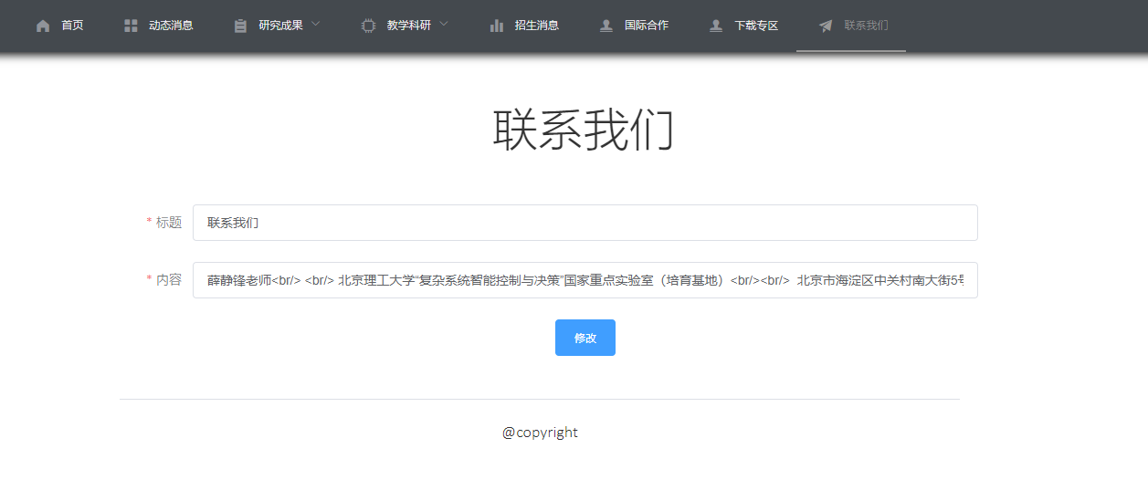 本系统是一个复杂网络与安全研究实验室对外展示以及内部管理的平台,提供一些简单的对外宣传、公告发布、内部管理以及对现有网页数据导入等功能。主要提供三个用户视图,一个是针对游客的实验室网站前端展示功能,一个是针对注册用户的实验室内部管理功能,另一个是针对网站系统管理员的高级别操作权限功能。