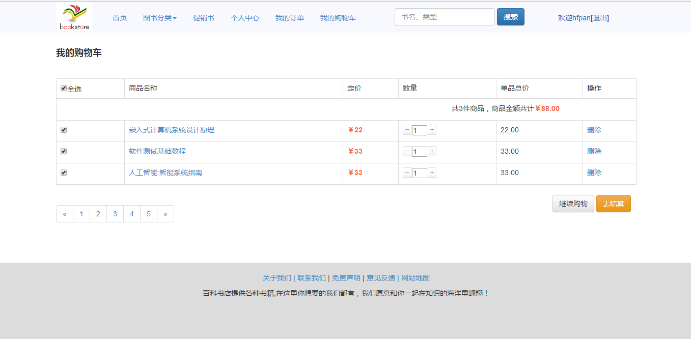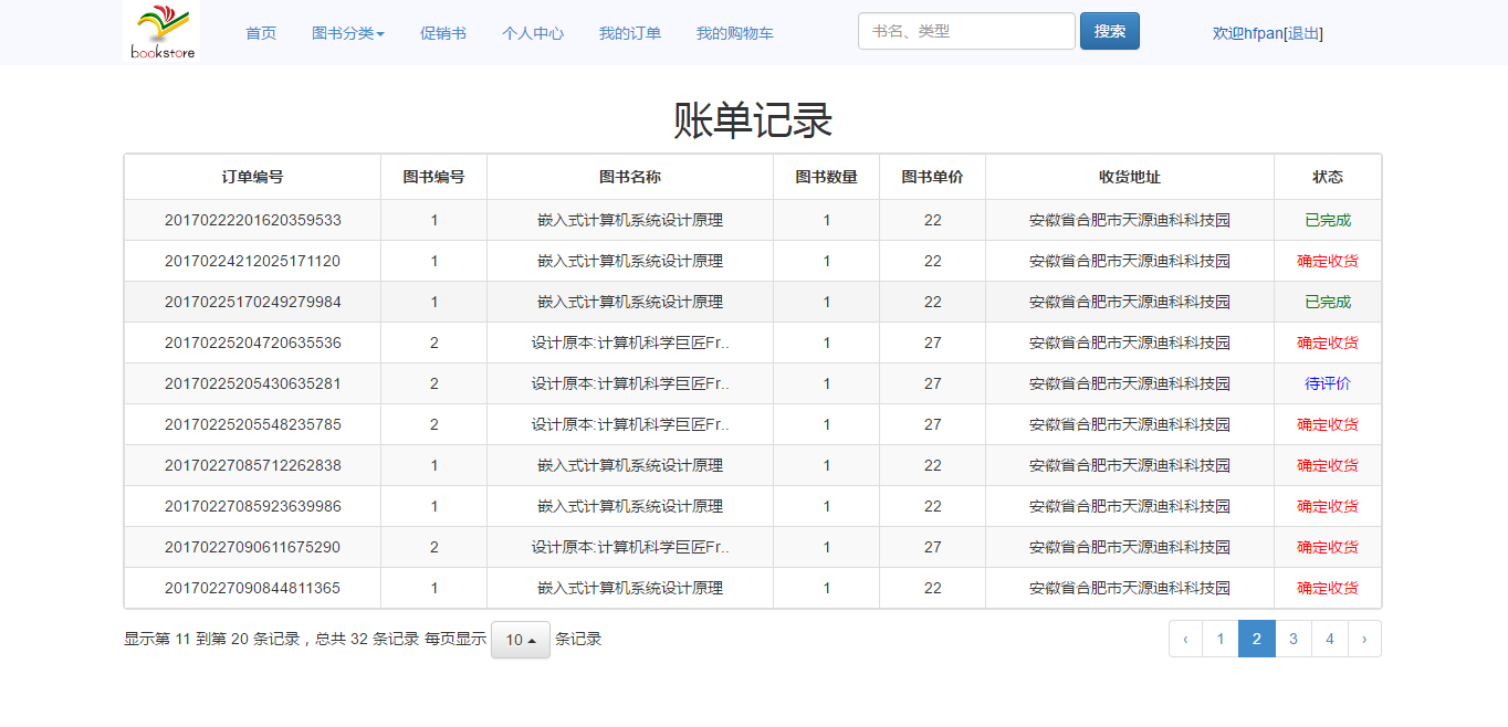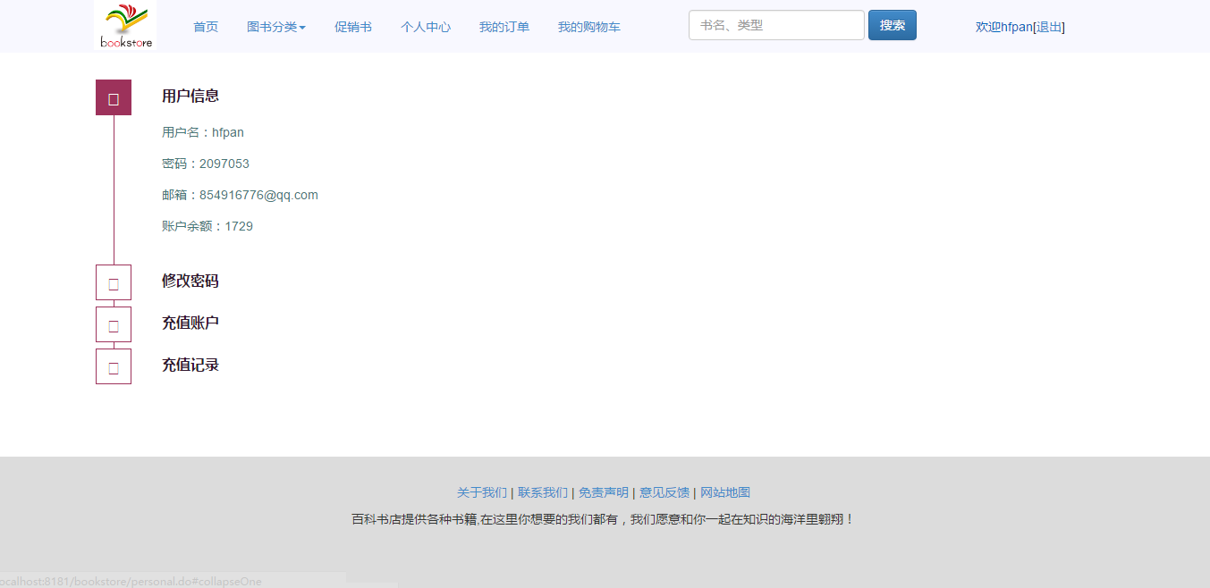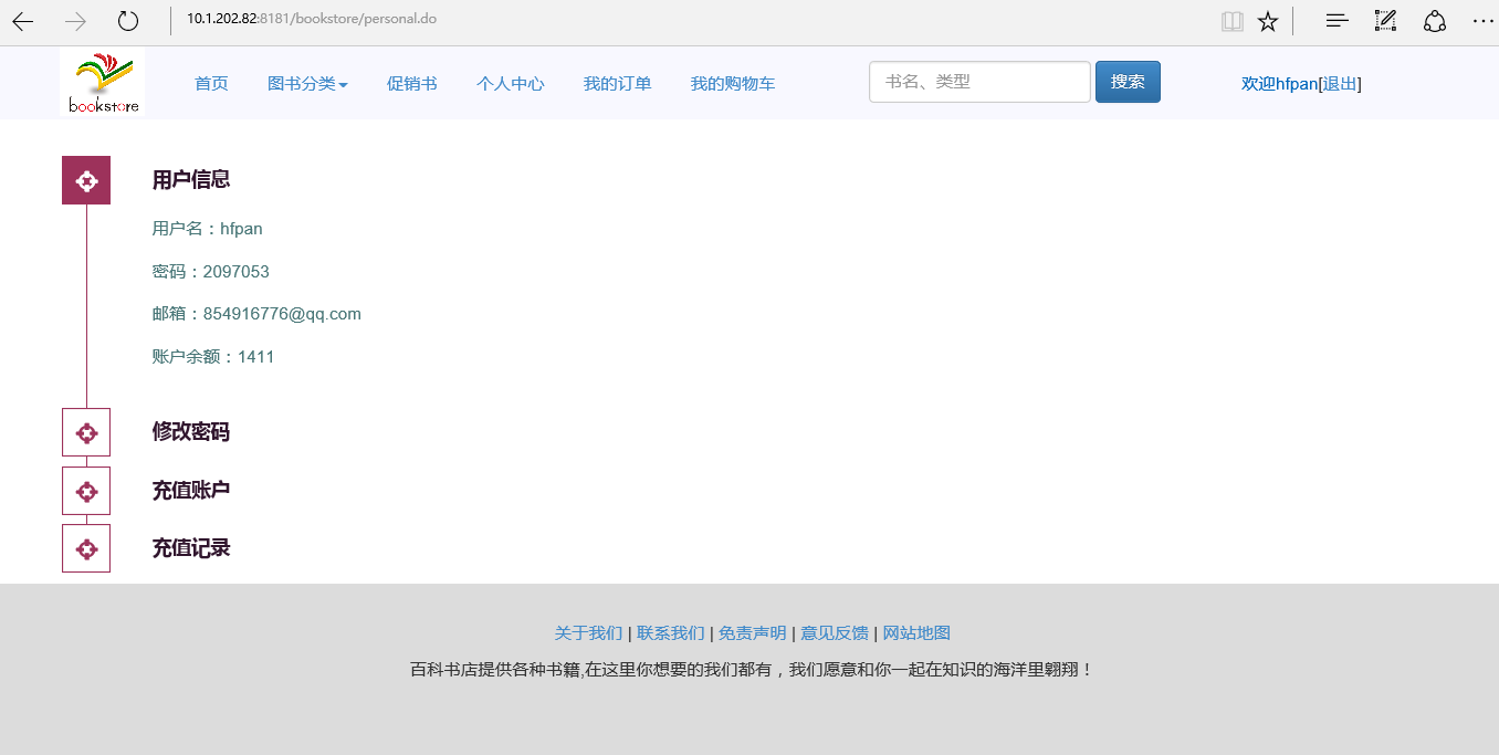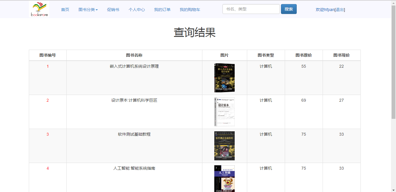 The system implements the functions of user management, book search, book sales, shopping cart, order management, payment recharge and so on. After the completion of the system development, after the test, its function can be normal operation, to meet the needs of users.