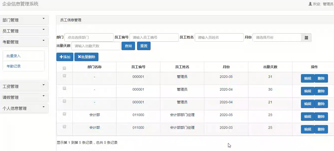 该系统实现了员工信息的录入、查询、编辑和删除功能,同时还实现了员工信息的统计分析功能。对于大数据量的员工信息,系统使用了分布式计算和存储技术,提高了系统的性能和可扩展性。系统采用了前后端分离的设计模式,前端使用了Vue.js框架,实现了良好的用户交互体验。后端使用了Spring框架管理Bean,Spring MVC框架处理请求,MyBatis框架实现了数据的持久化和管理。系统还实现了权限管理功能,对于不同的用户,可以设置不同的权限来限制其访问和操作系统的功能和数据。