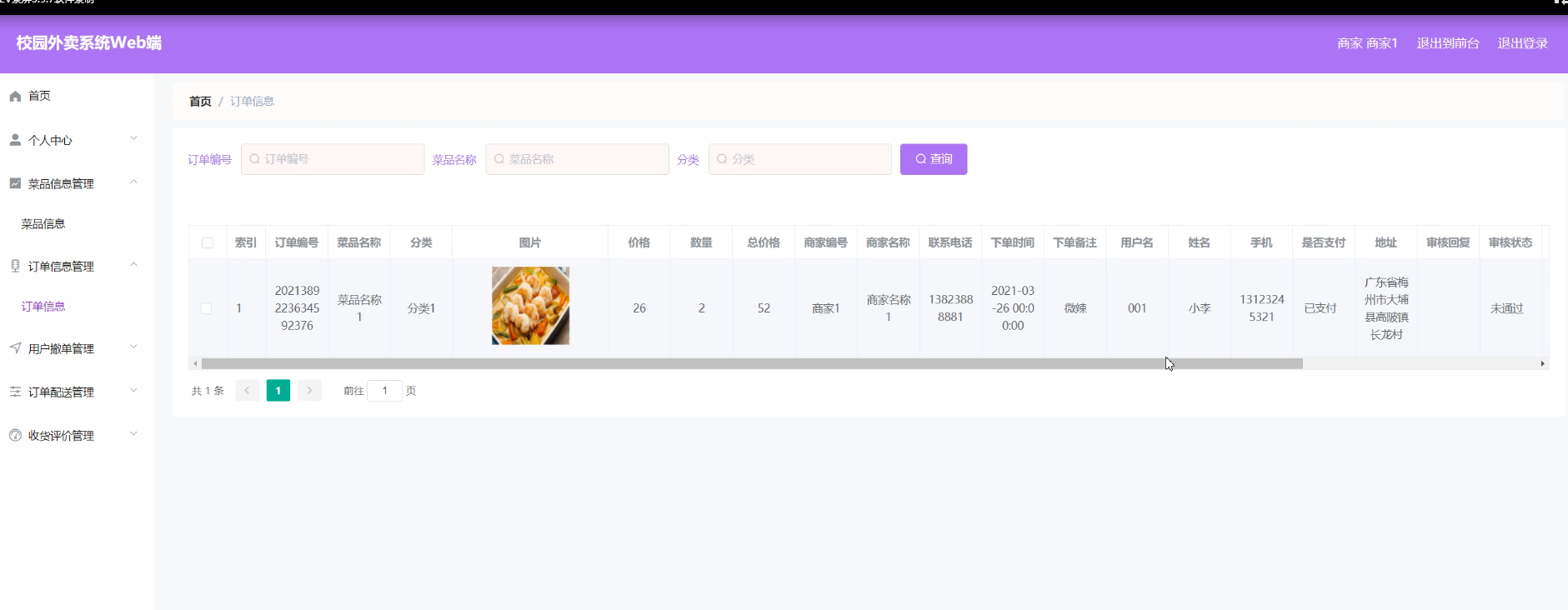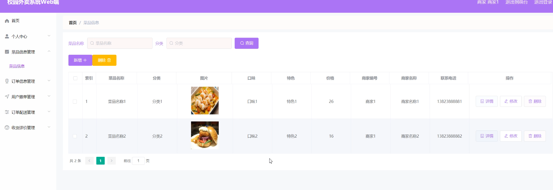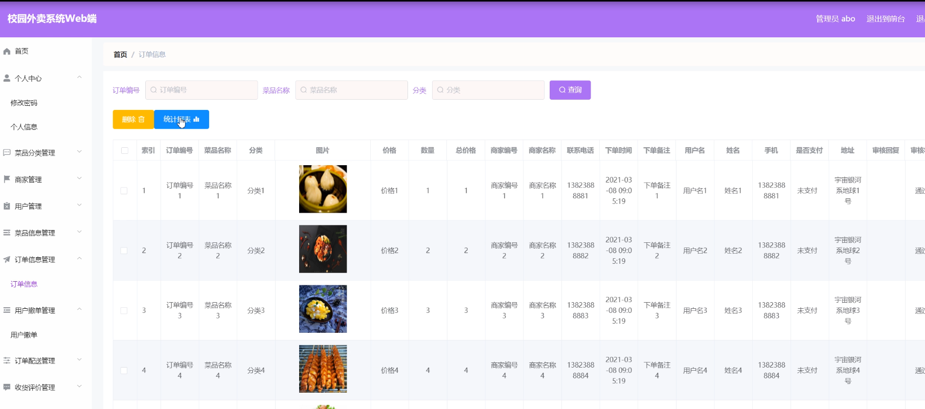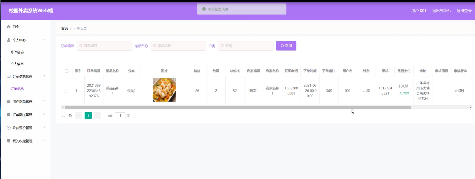本文的主要贡献包括:提出了一种基于大数据技术的校园外卖系统的设计思路和实现方法,为校园内外卖业务的管理和发展提供了新的思路和方法。使用Python语言进行开发,采用mysql数据库进行数据存储,使用pycharm软件进行开发,使系统具有高效、稳定和易于维护的特点。引入了大数据技术,如数据挖掘和分析等,对订单数据进行深入挖掘和分析,提高了系统的预测和推荐能力,为用户提供更优质的服务。实现了一个完整的校园外卖系统,包括用户端、商家端、配送员端等多个模块,为各类用户提供了一个方便、快捷、高效的外卖服务平台。