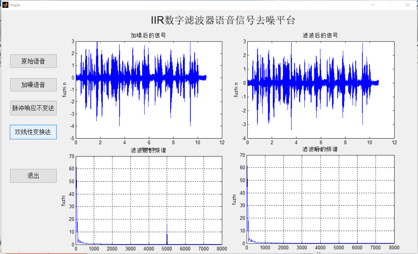 首先是对无噪语音进行频谱分析,然后对其加噪声并对加噪后的语音进行频谱分析。分别采用脉冲响应不变法和双线性变换法设计出了无限长单位冲激响应(IIR)数字滤波器。并完成对加噪语音的去噪处理。通过计算比较去噪后语音信号的信噪比不同从而得出不同类型滤波器的优劣。最终借助GUI设计了语音信号去噪系统的图形用户界面,增强了系统程序的可视性和友好性。