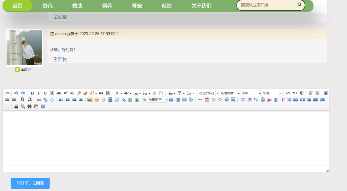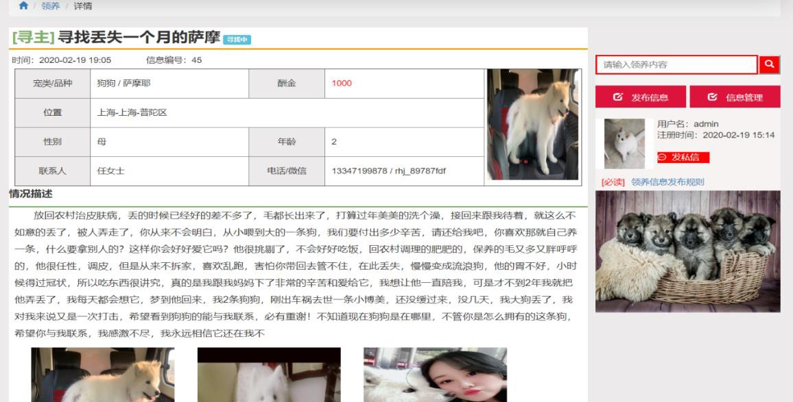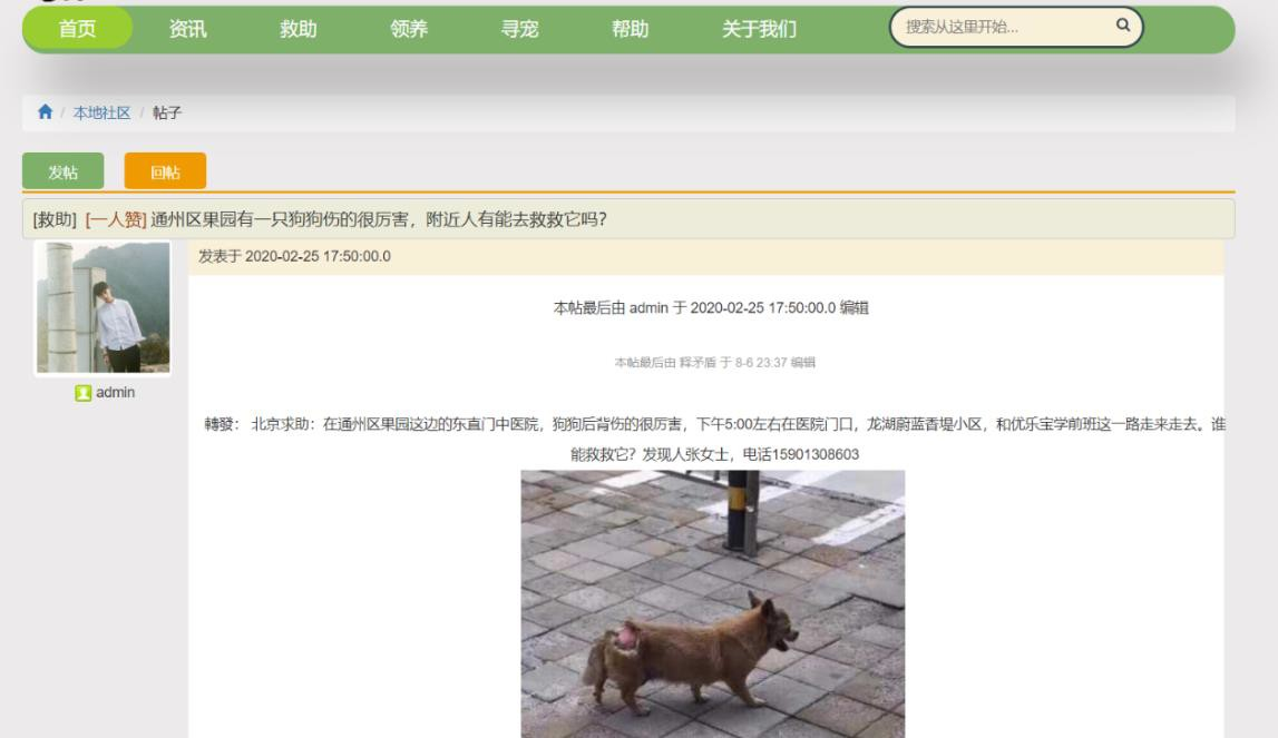 该流浪动物救助系统是基于Java语言开发,系统分为普通游客端、注册用户端和管理员端。在该平台上,普通游客端可以浏览别人发布的救助、寻宠、领养等信息, 及时的参与到救助中去。而注册用户端不仅可以浏览各类信息,同时也可以登记自己发现的流浪动物的信息,或者是寻找丢失的宠物和为爱宠寻找新的主人等操作。而管理员端,可以发布公告,对注册用户及被救助动物进行管理、登记、审核相关信息以及查询统计等功能。该平台是一个功能较完善、操作简单的平台。