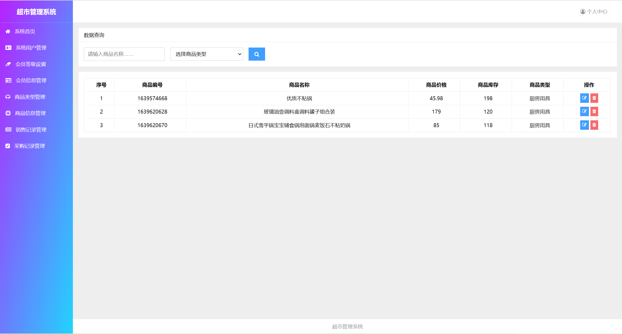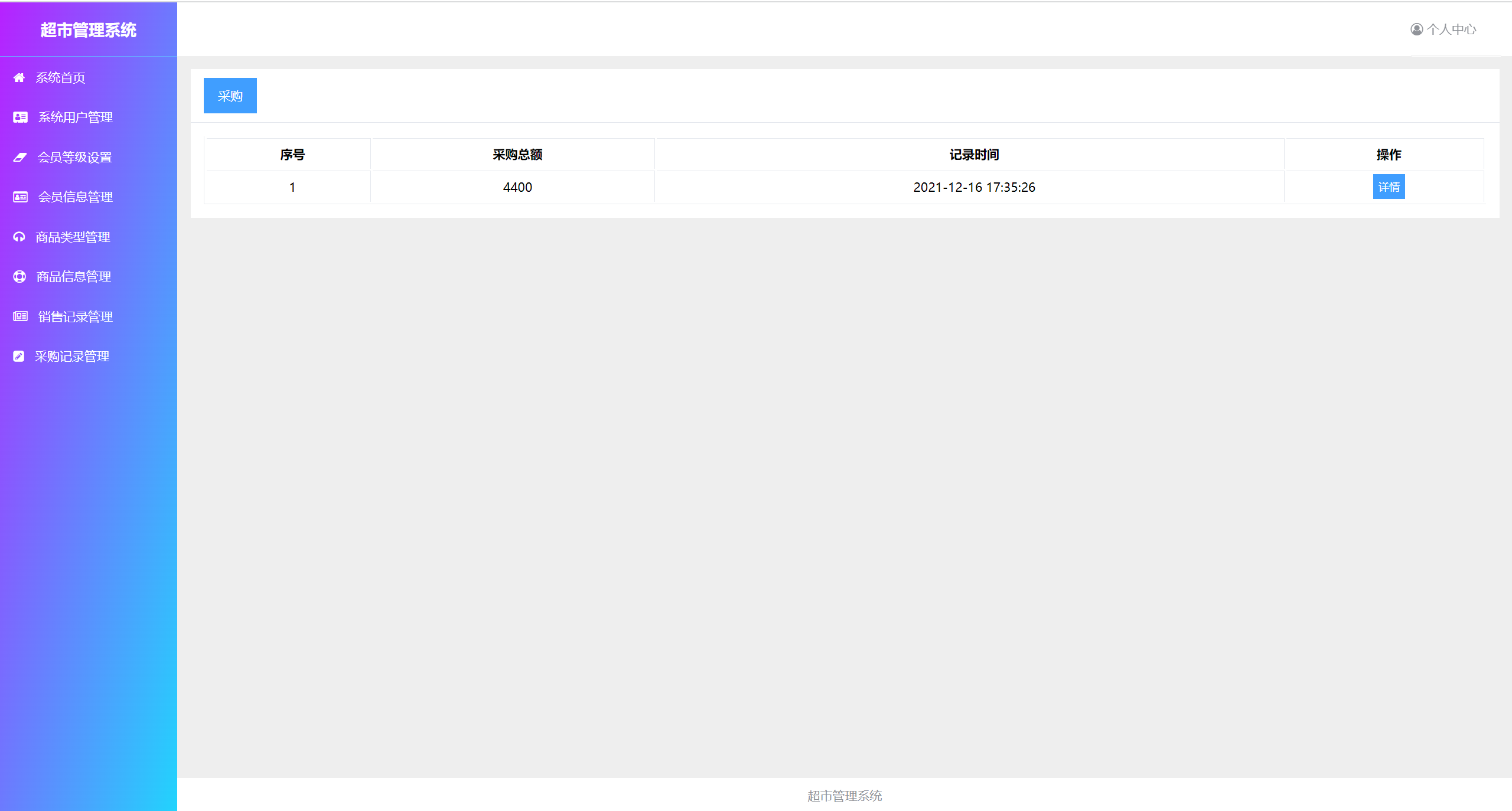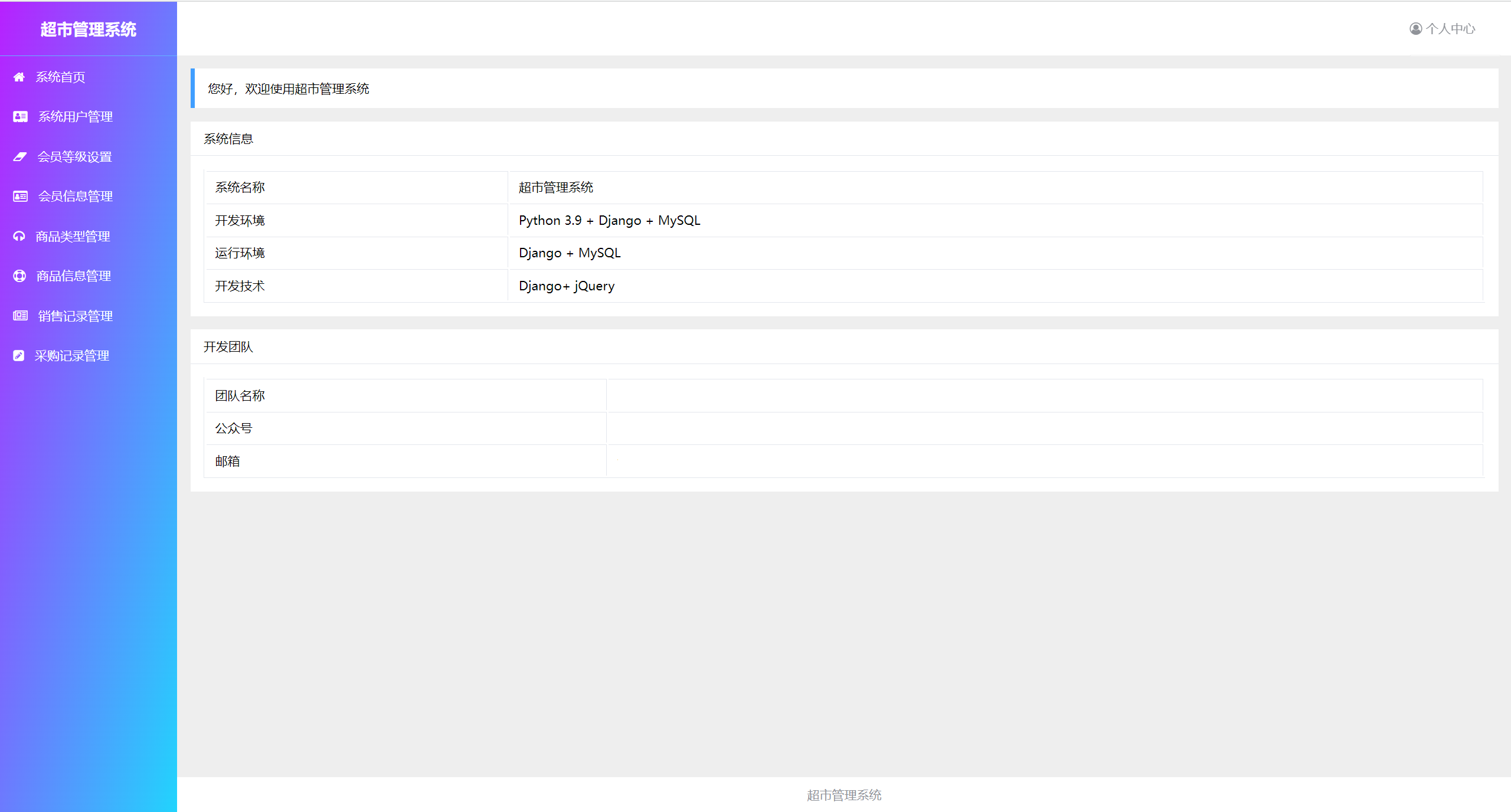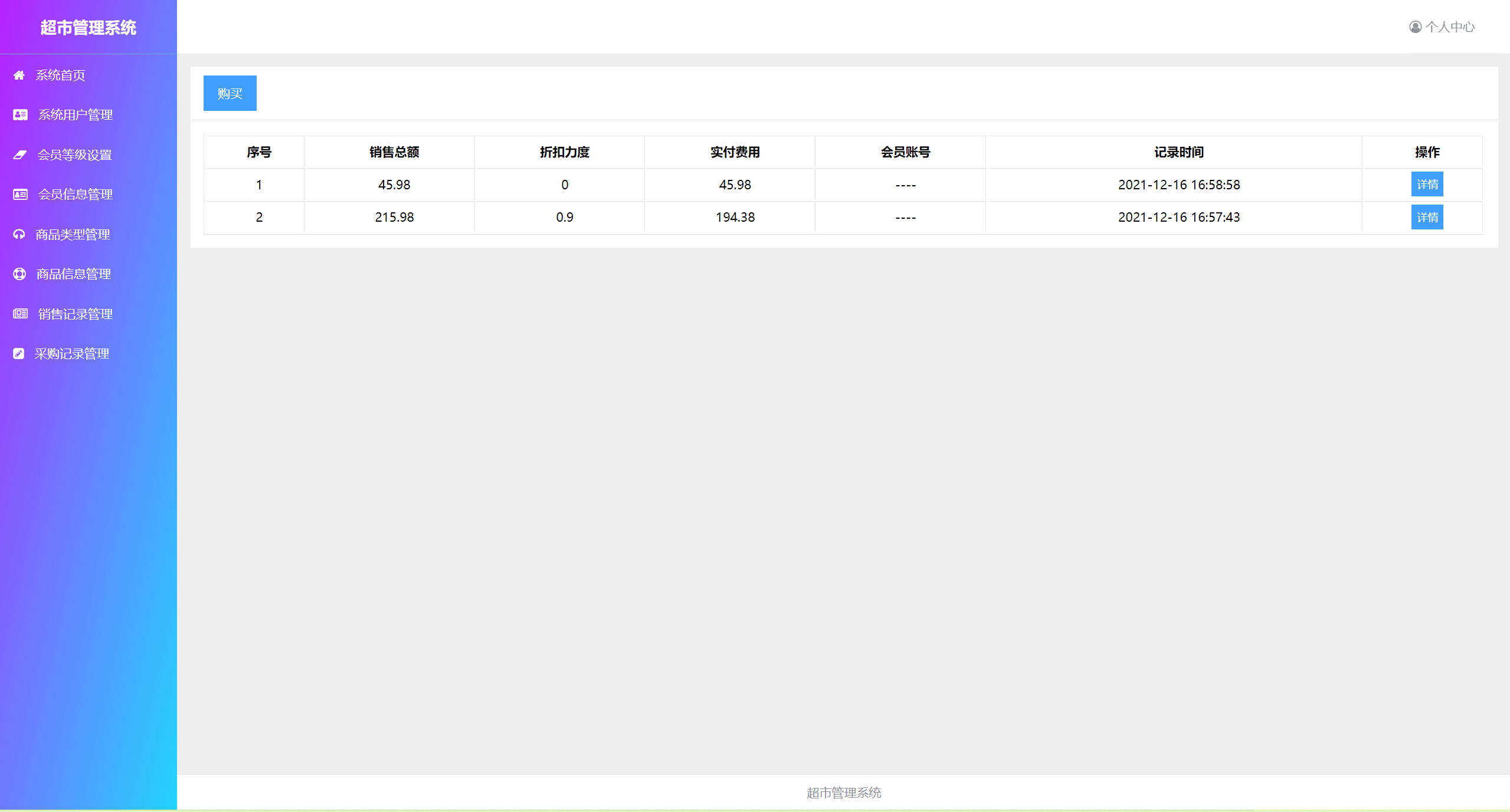 With the improvement of people's living standards, the daily consumption level is also gradually improving. In order to meet people's living needs, more and more comprehensive large supermarkets have appeared. These provide convenience for people's lives, and in order to better manage supermarkets , so it is imperative to develop a complete management system. This system uses PyCharm as the development tool, MySQL database system as the background data management, and uses Vision to draw the corresponding graphics to help us better understand the situation of the system and establish a clear understanding of the system. Vision is also the most commonly used in development. modeling tools. The development is mainly carried out under the Windows system, and the development is completed with the Python language that supports cross-platform , so after the project development is completed, it can be run in any development environment. The system mainly includes eight aspects: system general module, user management module, member management module, member level module, commodity type module, commodity management module, sales management module and purchasing management module, and completes the management of commodity information and supermarket operation management. , and operations such as browsing, querying, adding, deleting, and modifying various types of information. The system realizes the basic information management and function management of various commodities, accelerates the transaction efficiency in the process of commodity sales, and provides convenience to users .