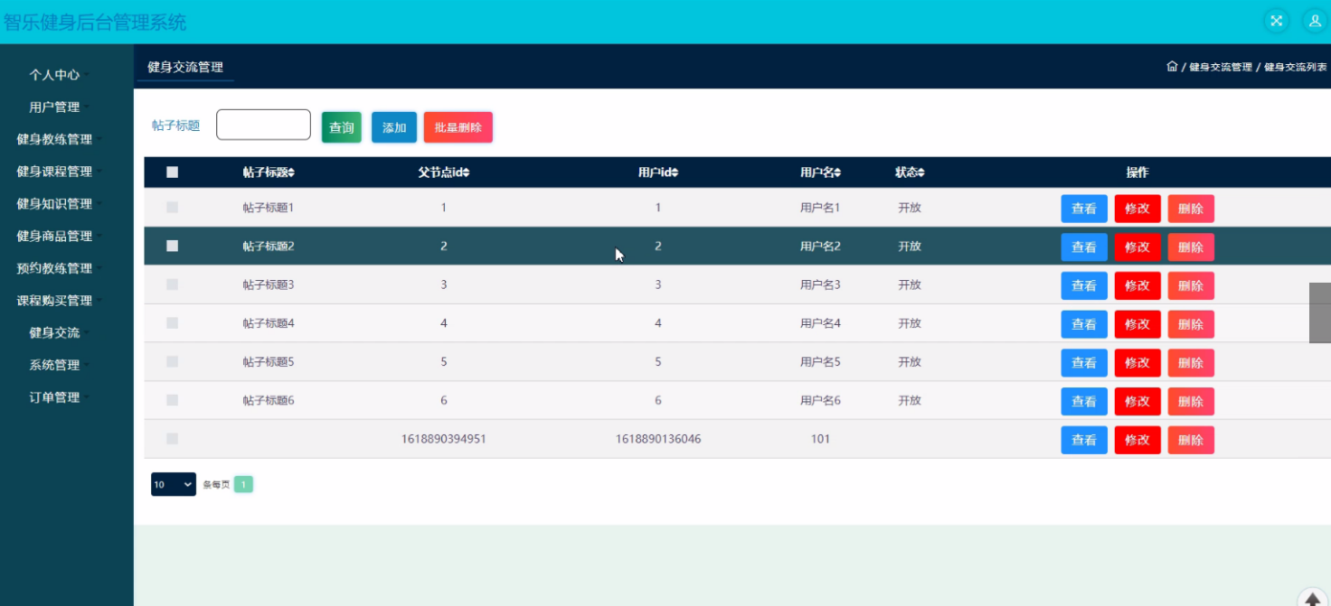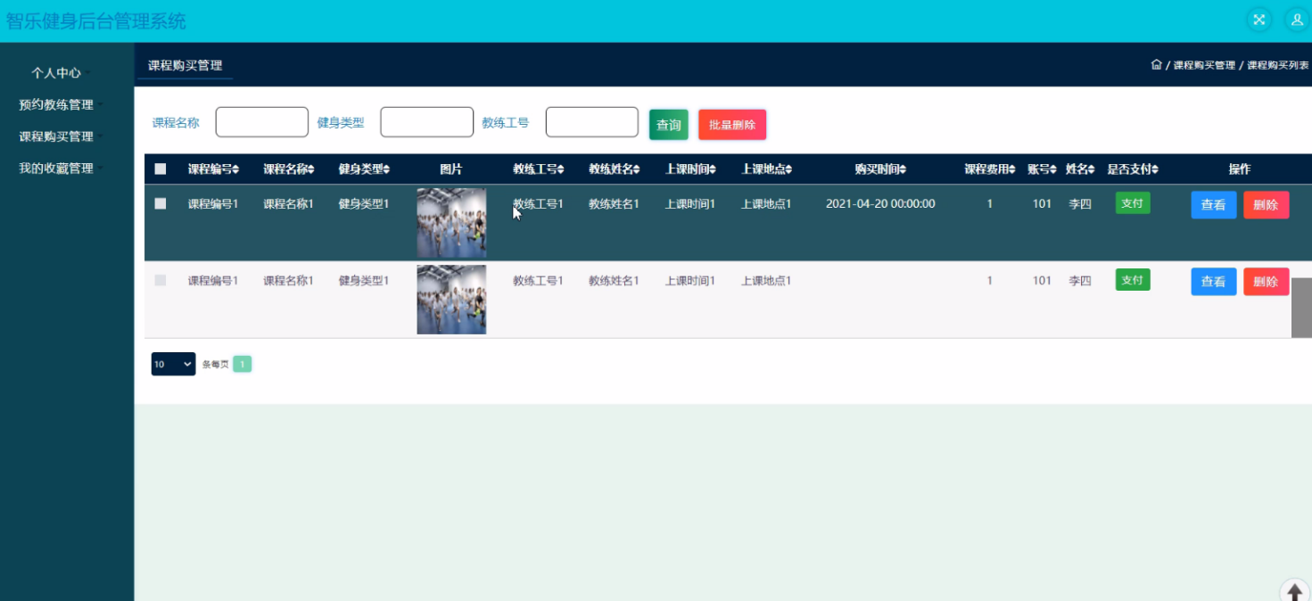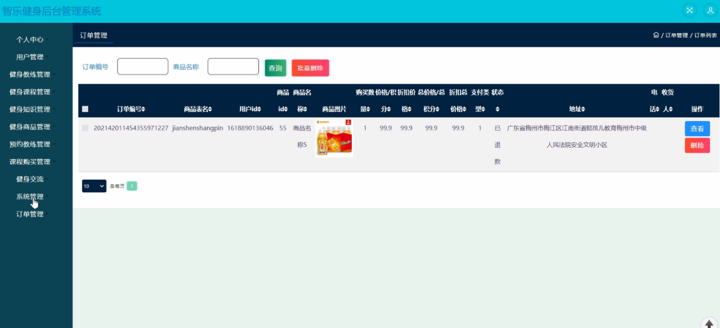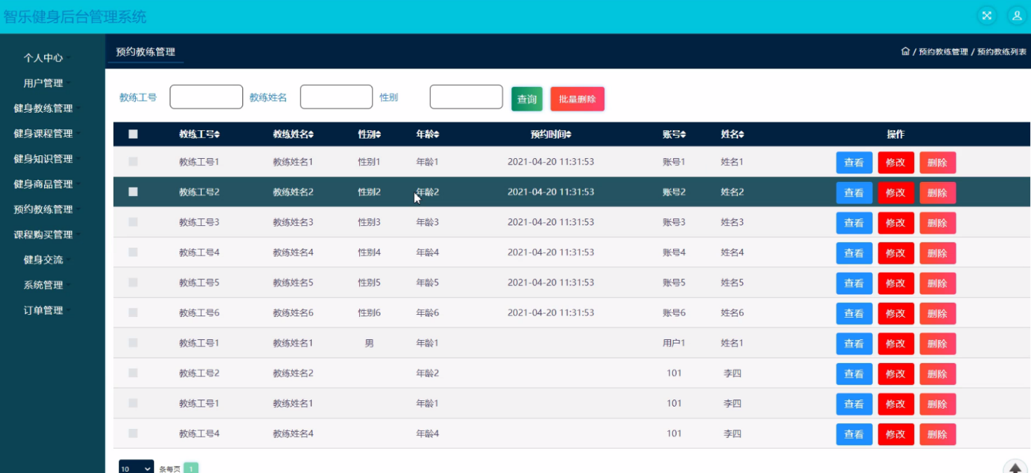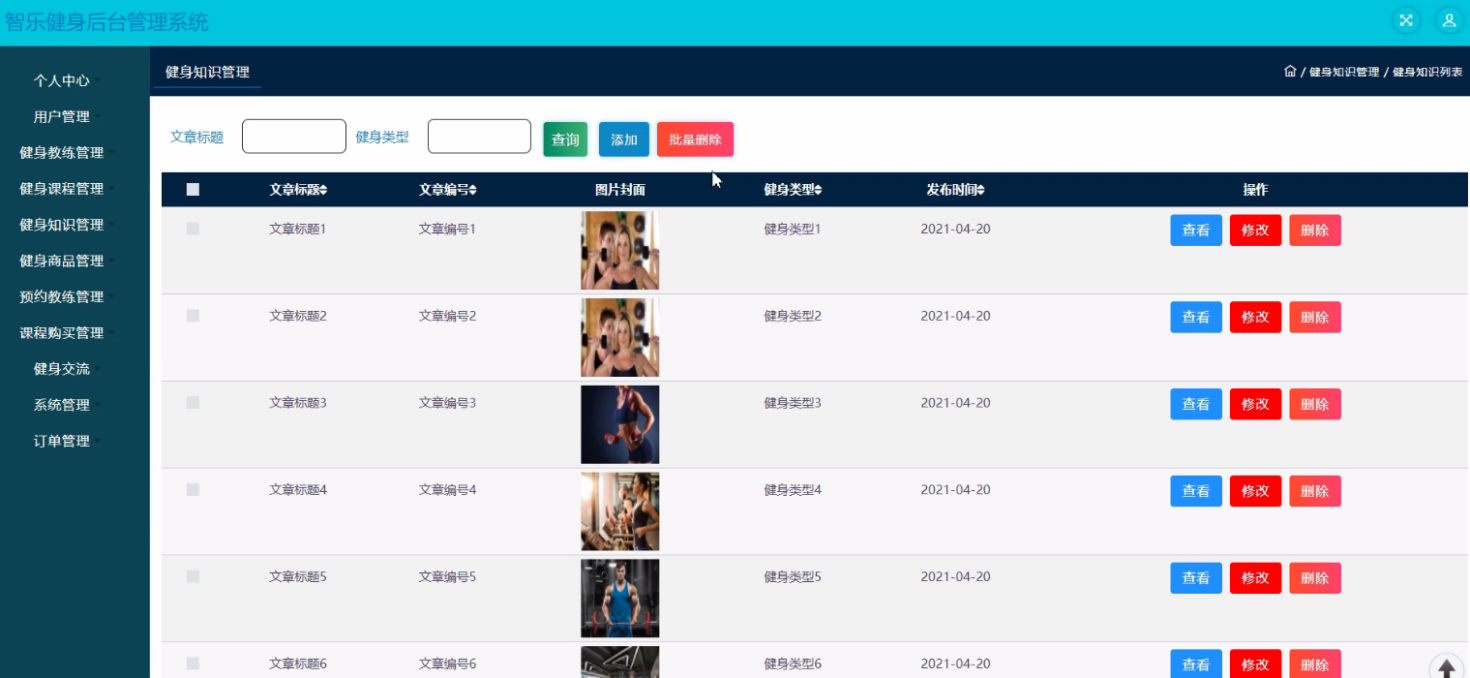 The website system uses dynamic web development, Java as the development language of the system, MySQL as the background database. Design and develop a system with administrator; Personal center, user management, fitness coach management, fitness course management, fitness knowledge management, fitness commodity management, appointment coach management, course purchase management, fitness communication, system management, order management, user management; Personal center, appointment coach management, course purchase management, my collection management, front page; Home page, fitness coach, fitness courses, forum information, my, jump to the background, shopping cart, online customer service and other functions of Zhile fitness background management system. In the design process, it fully ensures the good readability, practicability, expansibility, universality, easy to maintain, easy to operate and concise page of the system code.