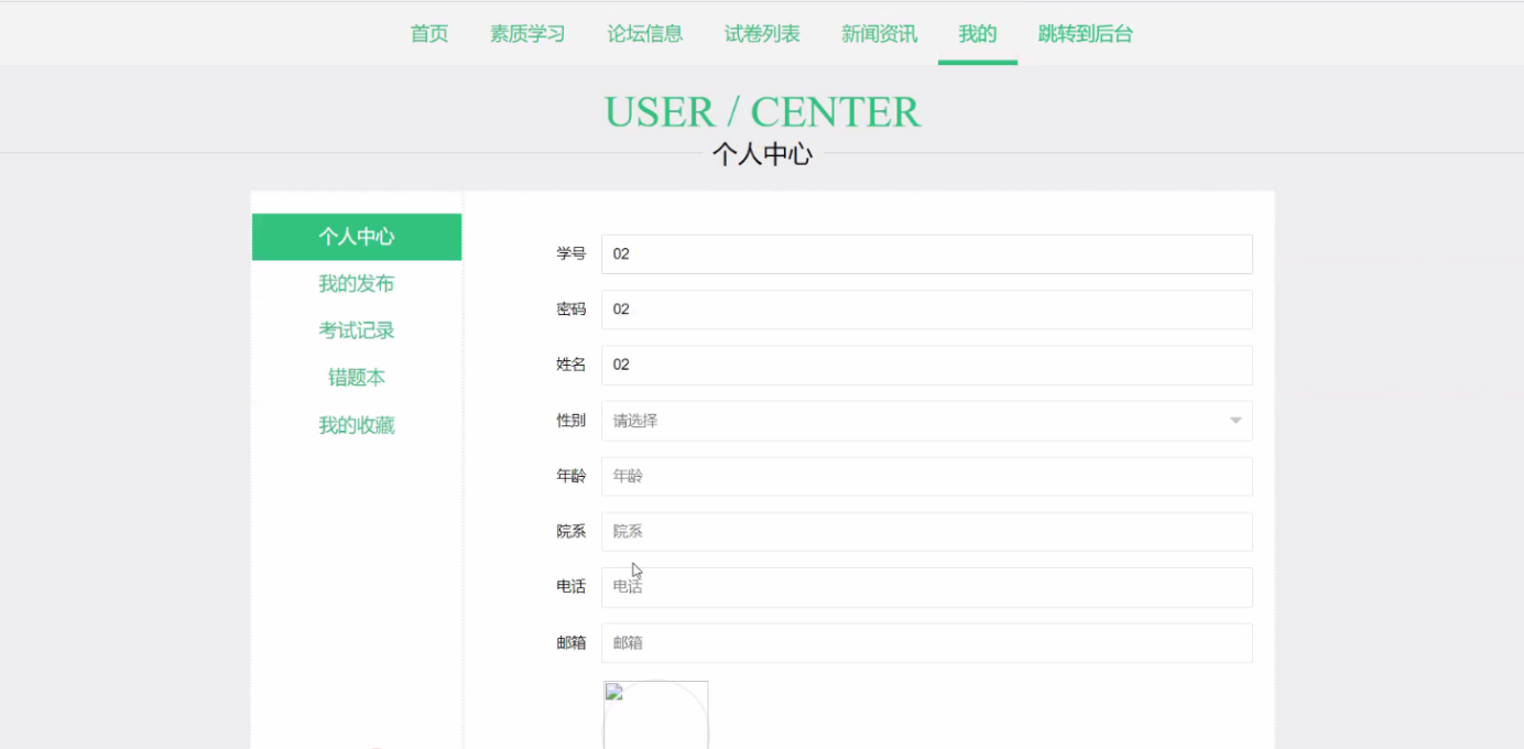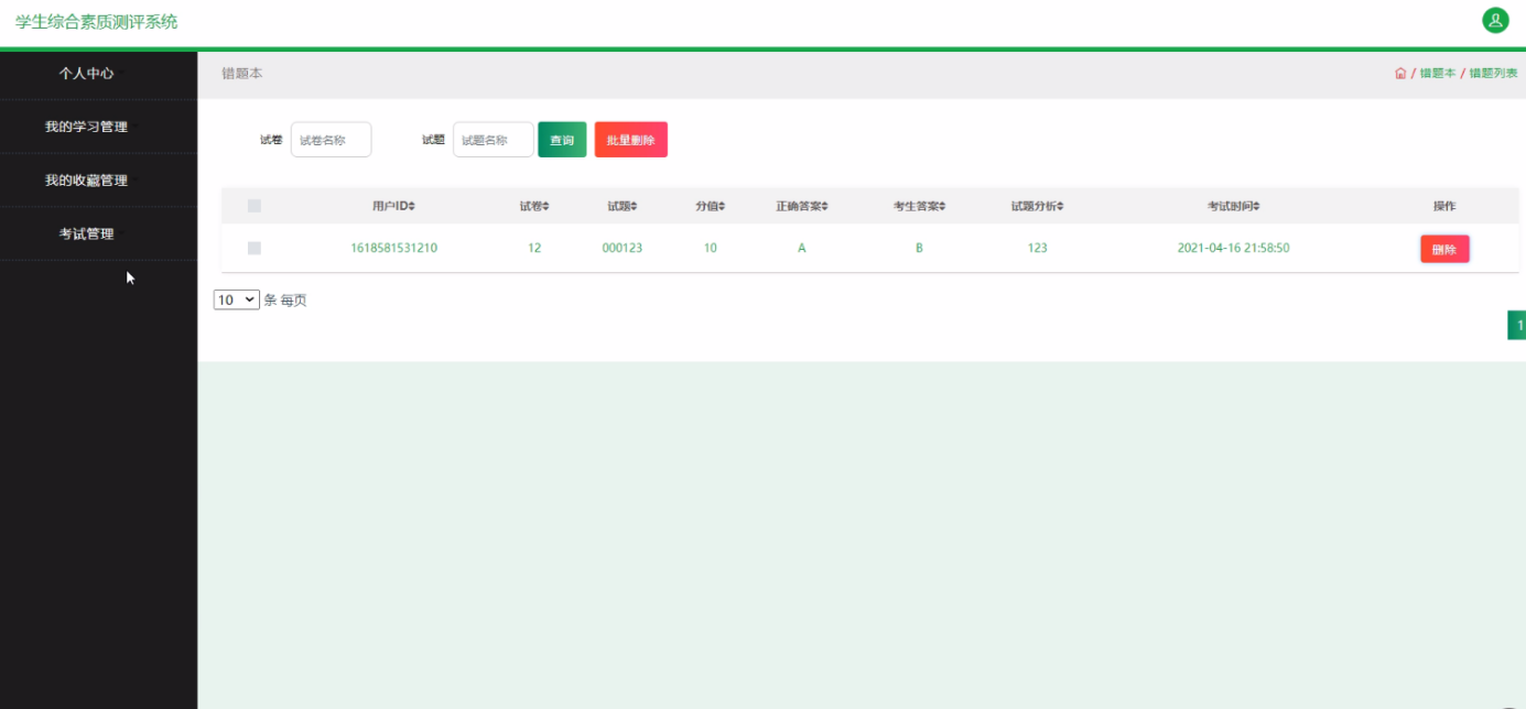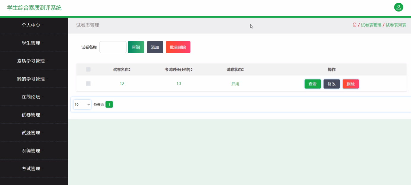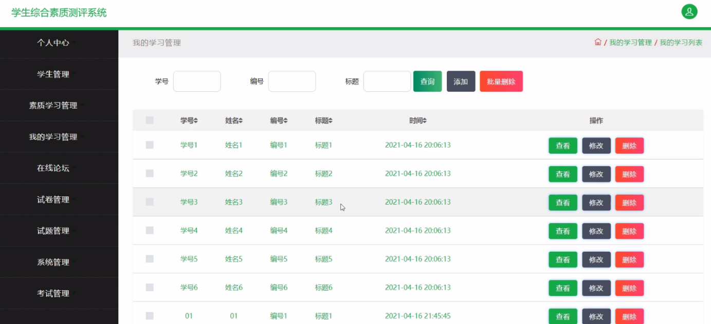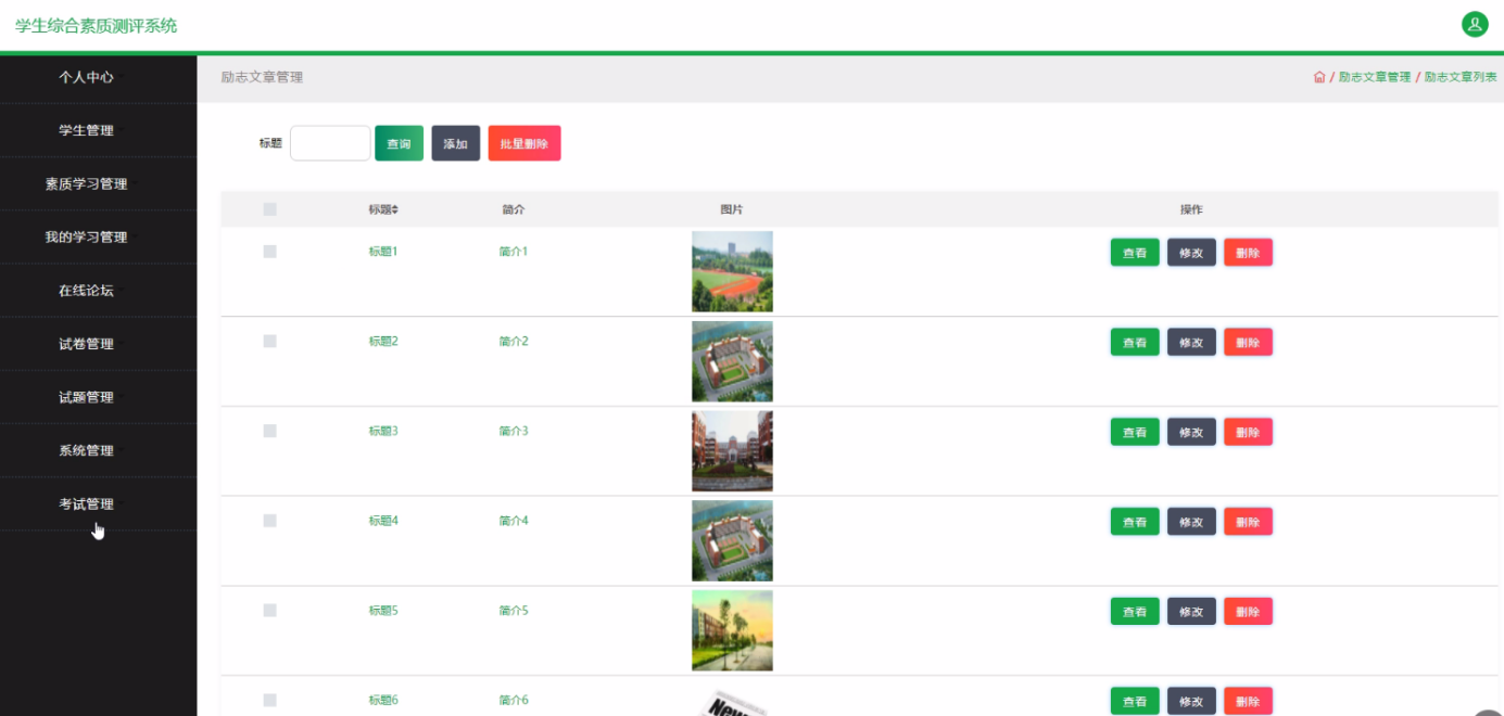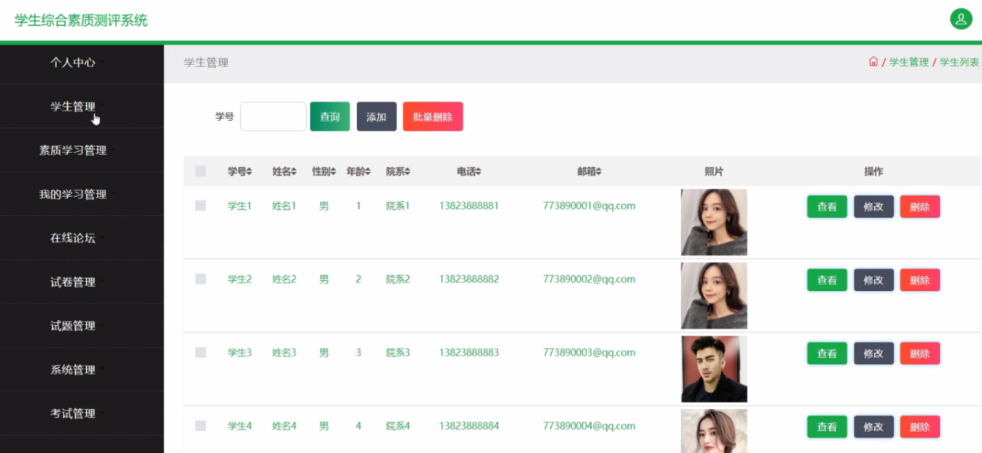 本学生综合素质测评系统是针对目前学生综合素质测评系统的实际需求,从实际工作出发,对过去的学生综合素质测评系统存在的问题进行分析,结合计算机系统的结构、概念、模型、原理、方法,在计算机各种优势的情况下,采用目前最流行的B/S结构、java语言MySQL数据库设计并实现的 。本学生综合素质测评系统主要包括登录管理员模块如下:个人中心、学生管理、素质学习管理、我的学习管理、在线论坛、试卷管理、试题管理、系统管理、考试管理,学生:个人中心、我的学习管理、我的收藏管理、考试管理,前台首页;首页、素质学习、论坛信息、试卷列表、新闻资讯、我的、跳转到后台等多个模块。它帮助学生综合素质测评系统实现了信息化、网络化,通过测试,实现了系统设计目标,相比传统的管理模式,本系统合理的利用了网络数据资源,有效的减少了学生综合素质测评系统的经济投入,大大提高了工作人员的效率。