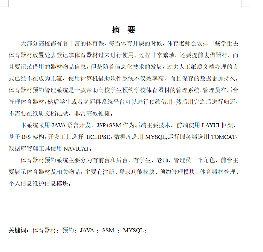 关键词:体育器材;预约;JAVA ;SSM ;MYSQL;