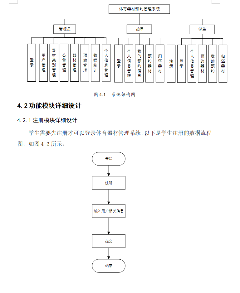 体育器材预约系统主要分为有前台和后台,有学生、老师、管理员三个角色,前台主要展示体育器材及相关物品,主要有注册、登录功能模块、预约管理模块、体育器材管理、个人信息维护信息模块。