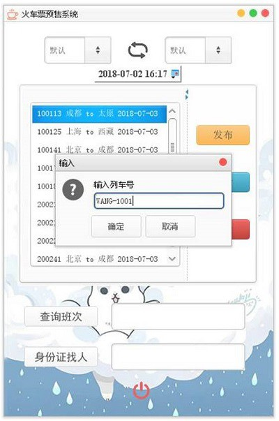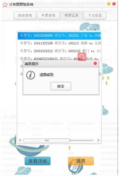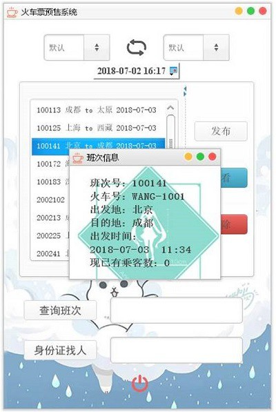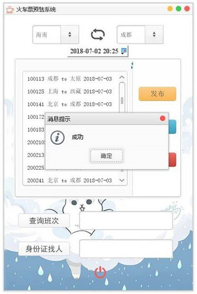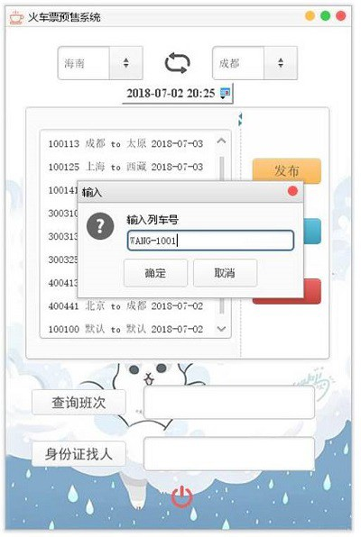 乘坐火车是我们生活中几乎不可缺少的一件事儿,每天都会有各种各样的火车班次发布与被预定。针对这个火车票 预售的环节我设计了一个火车票预售系统,为购票用户与卖票管理人员之间搭建平台。让我们的用户能够通过该软 件对管理人员发布的航班进行预购与查询。另一方面也可以加强我们的管理人员对班次信息与乘客的管理与查询。
