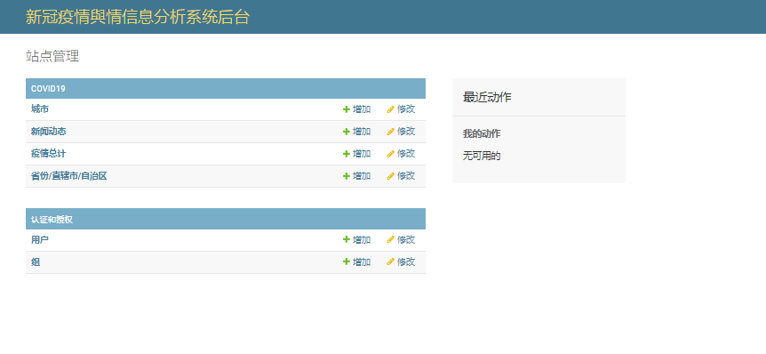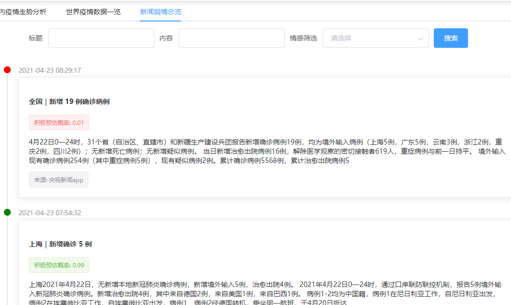 COVID-19,全称Corona Virus Disease 2019,是世卫组织对新型冠状病毒肺炎的官方命名,简称“新冠肺炎”,指的是2019年发生的新型冠状病毒感染导致的肺炎。2019年12月以来,湖北省武汉市部分医院陆续发现了多例不明原因肺炎病例,最终证实为2019新型冠状病毒感染引起的急性呼吸道传染病。虽然我国采取了坚决有效的防疫措施迅速控制了疫情,但是由于其他某些国家对疫情管理的懈怠,这场可怕的病毒还是很快席卷了全球,对全世界人民生产生活带来了天翻地覆的影响,给全球经济打来了相当严重的冲击,这场疫情大爆发影响了全世界所有的人。为了让大家可以了解疫情的实时动向,并且对一些新闻进行一些理解分析,本文设计了一个基于Python的新冠疫情舆情分析系统。