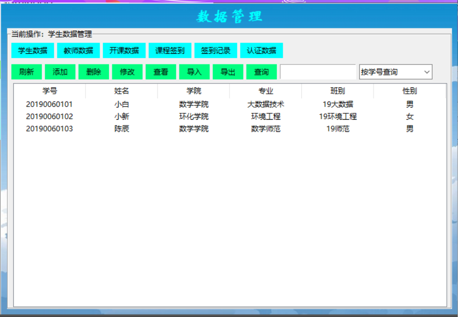 本系统取代了传统的人工操作,利用计算机辅助管理学生的课堂出勤及缺勤情况既提高了签到的科学性,也减轻了学校的工作负担。利用SQLite进行数据库的建立和编程设计,结合Python编程和Tkinter可视化编程,实现学生签到数据采集、数据统计和信息查询过程的自动化,完善学生管理现代化,方便管理人员统计、考核学生出勤情况,准确地掌握学生出勤情况和相关资料,有效地管理、掌握学生各项情况。