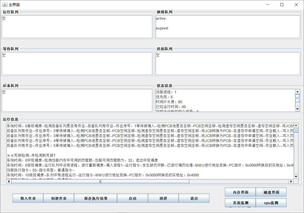 系统模拟仿真了Linux2.6系统,并实现了作业及进程并发环境、MMU 地址变换、进程原语、页表生成与页面调度算法、三级作业调度过程及算法(需作业调度到指令集,至少实现三态转换)、页面分配与回收算法、进程同步互斥、进程死锁检测与撤销算法,并将实现原理过程通过可视化方式呈现。