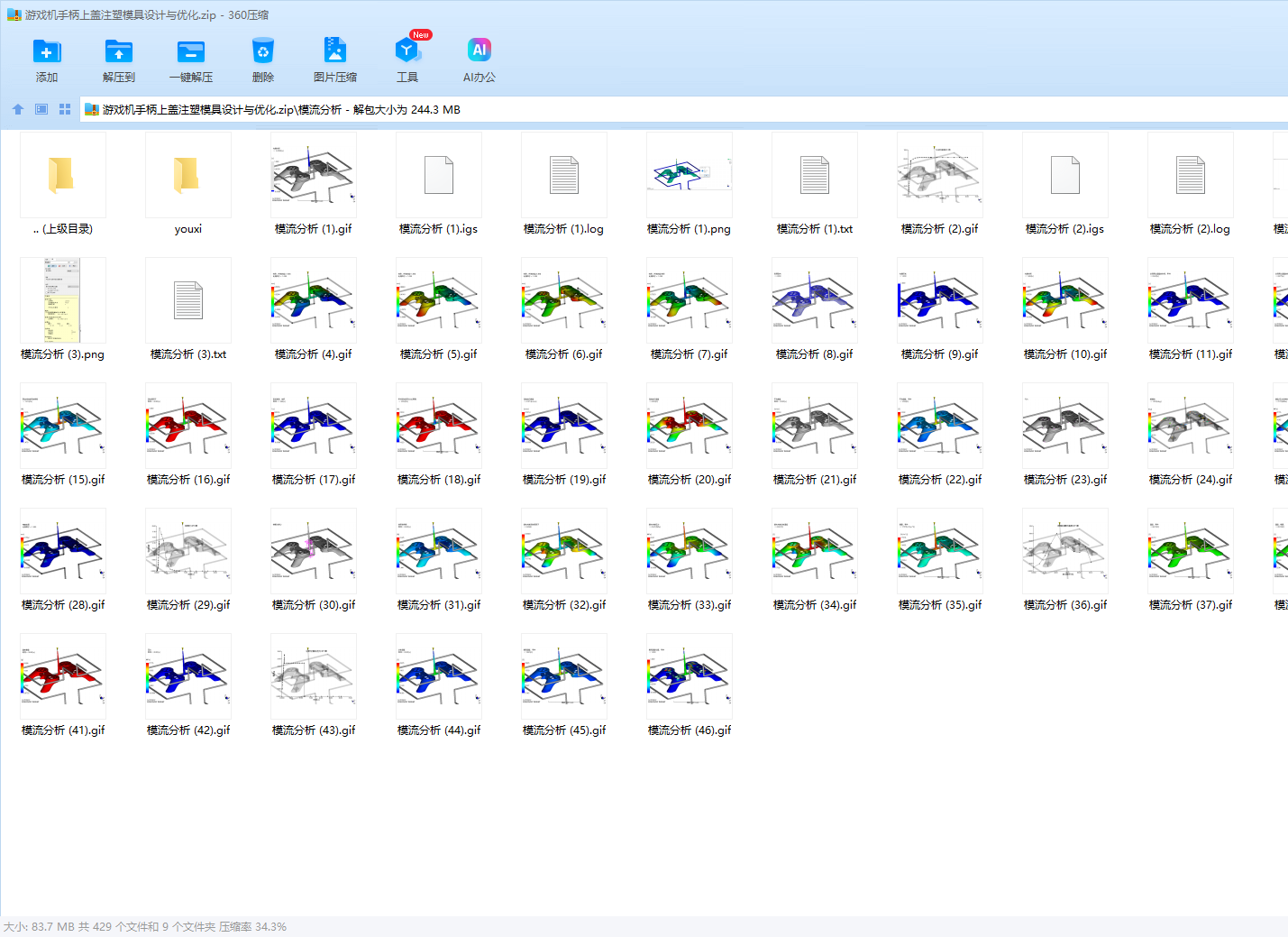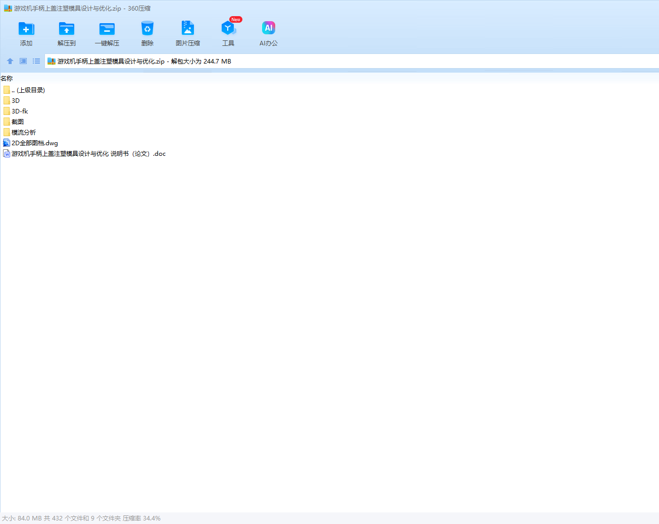 The graduation design takes the top cover of the game controller to design and optimize the injection mold. As a key component of home electronic products, the design of the controller cover should not only need to meet the functional requirements, but also take into account the appearance and user experience. Therefore, this design first carried out a detailed process analysis of the product, including the use of requirements, appearance requirements, etc., and selected ABS plastic as the raw material. Then, the key steps of mold typing surface selection, type cavity layout, gate design and size calculation of molding parts are conducted. At the same time, according to the injection molding volume, injection pressure and other parameters, the injection molding machine model was reasonably selected and checked.