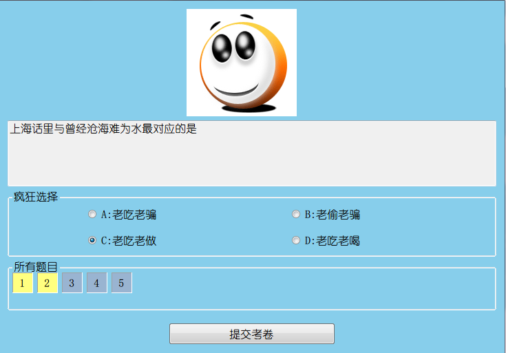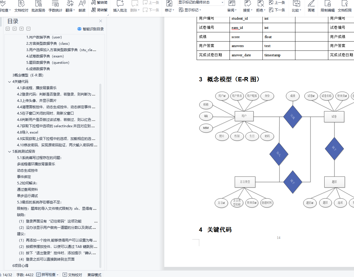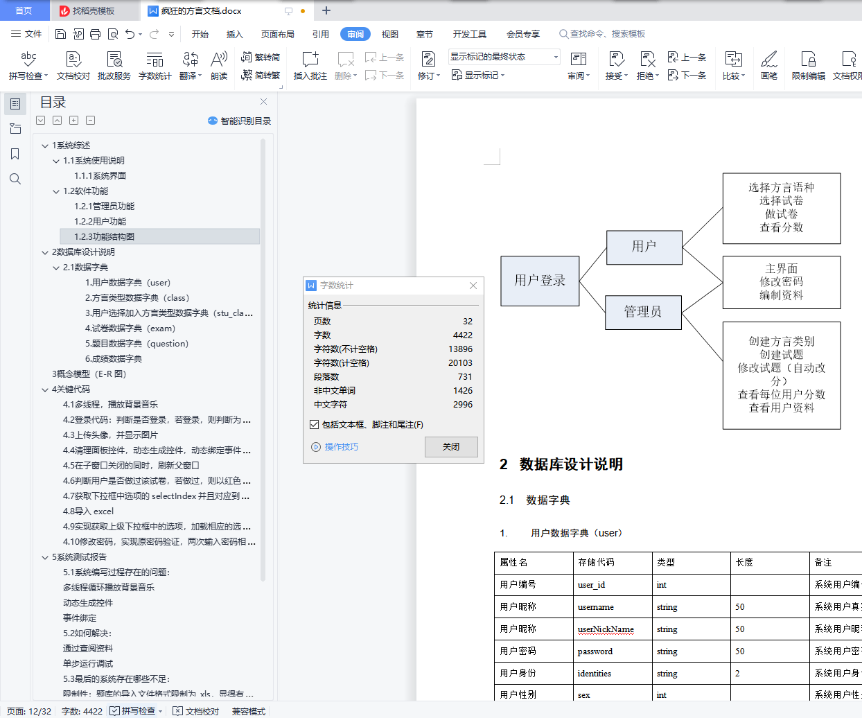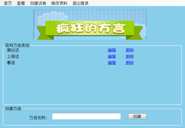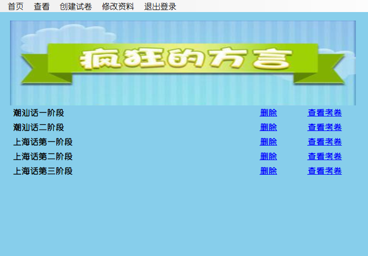 目录1 系统综述 21.1 系统使用说明 31.1.1 系统界面 31.2 软件功能 101.2.1 管理员功能 101.2.2 用户功能 111.2.3 功能结构图 112 数据库设计说明 122.1 数据字典 123 概念模型(E-R图) 144 关键代码 144.1 多线程,播放背景音乐 154.2 登录代码:判断是否登录,若登录,则判断为管理员或用户,显示首页,若未登录,则显示登录页面。 154.3 上传头像,并显示图片 164.4 清理面板控件,动态生成控件,动态绑定事件,使用匿名函数向事件函数传值 184.5 在子窗口关闭的同时,刷新父窗口 204.6 判断用户是否做过该试卷,若做过,则以红色绿色显示该题用户答案正确与否,若无做过,则实现点击单选按钮,改变题号颜色,标志该题已做过,同时记录用户答案。 224.7 获取下拉框中选项的selectIndex并且对应到相应的数据库中的字段 264.8 导入excel 264.9 实现获取上级下拉框中的选项,加载相应的选项并显示在下级下拉框中 274.10 修改密码,实现原密码验证,两次输入密码相同,并不可为空 305 系统测试报告 315.1 系统编写过程存在的问题: 31多线程循环播放背景音乐 31动态生成控件 31事件绑定 315.2 如何解决: 31通过查阅资料 31单步运行调试 315.3 最后的系统存在哪些不足: 31限制性:题库的导入文件格式限制为 xls,显得有些局限 31缺陷: 31(1)登录界面没有“记住密码”这项功能 31(2)没办法显示用户做完一道题的分数以及测试的计时 31建议: 31(1)再添加一个控件,能够使得用户可以设置为每做完一道题自动跳到下一道题,方便用户做题 32(2)按顺序摆放控件,以使可以通过TAB键跳到下一空格,方便用户填写资料 32(3)按下“退出登录”控件时,添加提示“确认要退出吗”窗口,以避免用户由于不小心的原因按了退出所造成的麻烦 32(4)登录之后可以直接跳转到主页面 326 项目心得 321系统综述1.1系统使用说明疯狂的方言系统包括:两个对象:管理员、用户。用户功能:注册、登陆、修改密码、编制资料、选择方言类型、选择已加入方言类型试卷、做试卷、查看试卷分数、退出八个模块。管理员功能:登陆、修改密码、编制资料、创建,编辑,修改方言类别、创建,删除试卷、查看用户资料、退出十个模块。