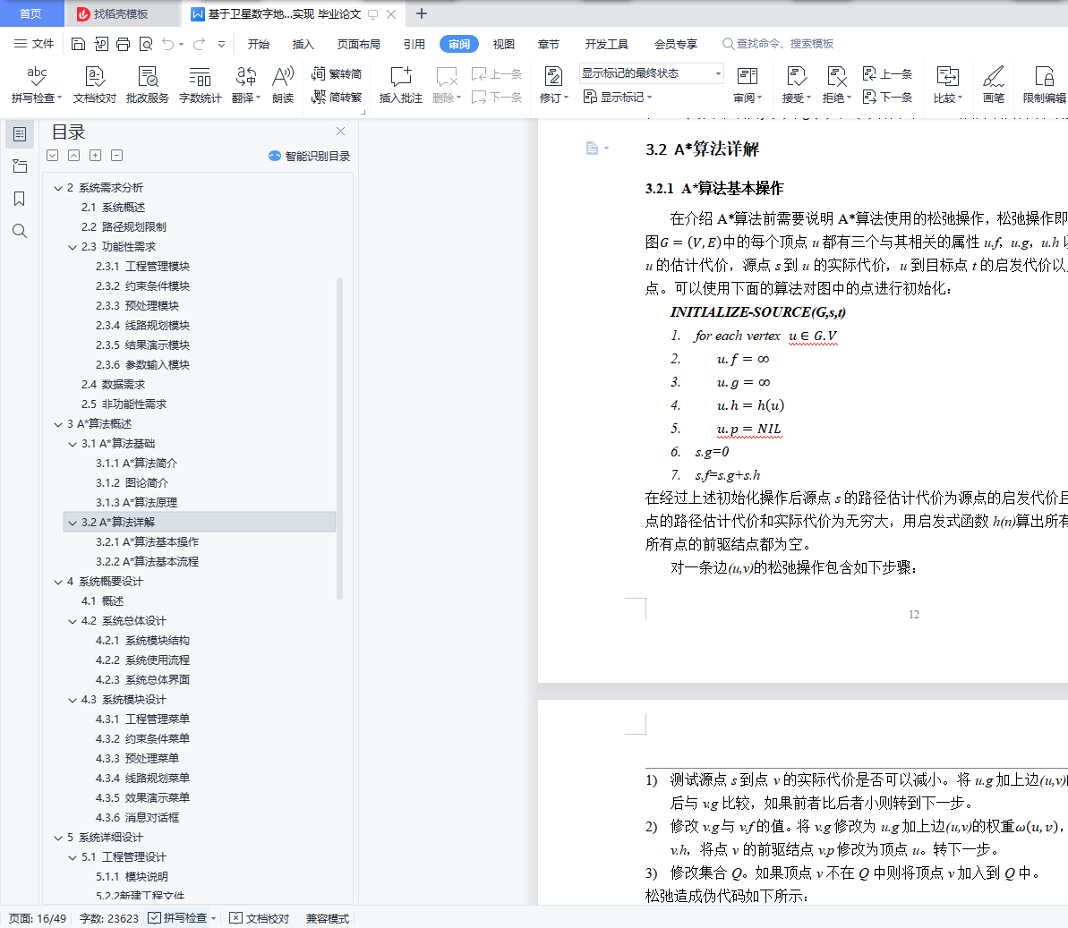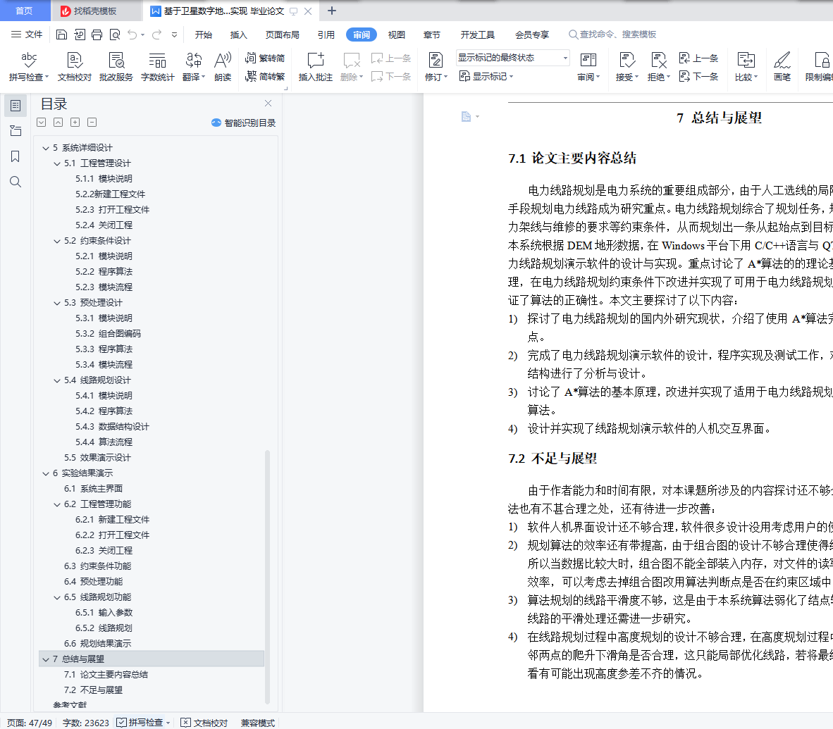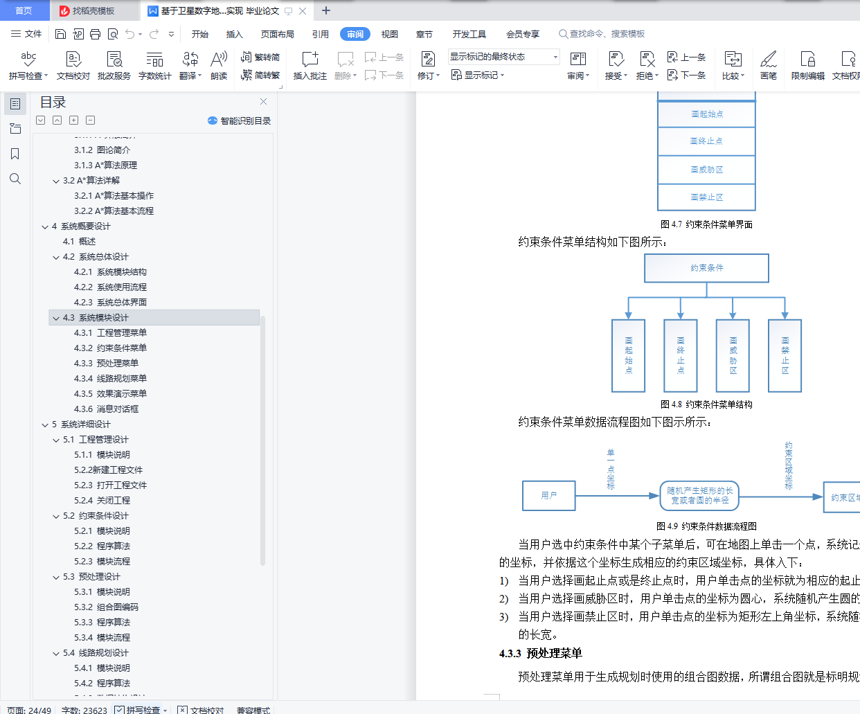 目 录摘 要 IAbstract 21 绪 论 11.1 课题背景及意义 11.2 国内外研究现状 21.3 课题主要研究内容和目的 21.4 论文组织结构 32 系统需求分析 32.1 系统概述 32.2 路径规划限制 42.3 功能性需求 52.4 数据需求 72.5 非功能性需求 73 A*算法概述 93.1 A*算法基础 93.2 A*算法详解 12RELAX-EDGE 136. 13PRINT-PATH(G,s,t) 133.2.2 A*算法基本流程 131. INITIALIZE-SOURCE(G,s,t) 132. 138. PRINT-PATH(G,s,t) 144 系统概要设计 164.1 概述 164.2 系统总体设计 164.3 系统模块设计 185 系统详细设计 255.1 工程管理设计 255.2 约束条件设计 285.3 预处理设计 295.4 线路规划设计 315.5 效果演示设计 376 实验结果演示 386.1 系统主界面 386.2 工程管理功能 386.3 约束条件功能 396.4 预处理功能 406.5 线路规划功能 406.6 规划结果演示 417 总结与展望 437.1 论文主要内容总结 437.2 不足与展望 43参考文献 44