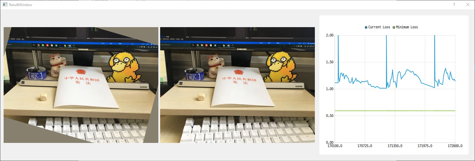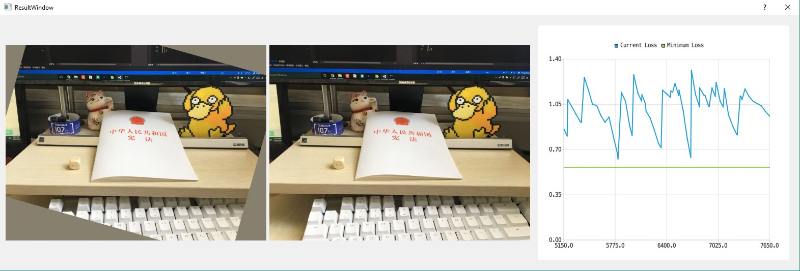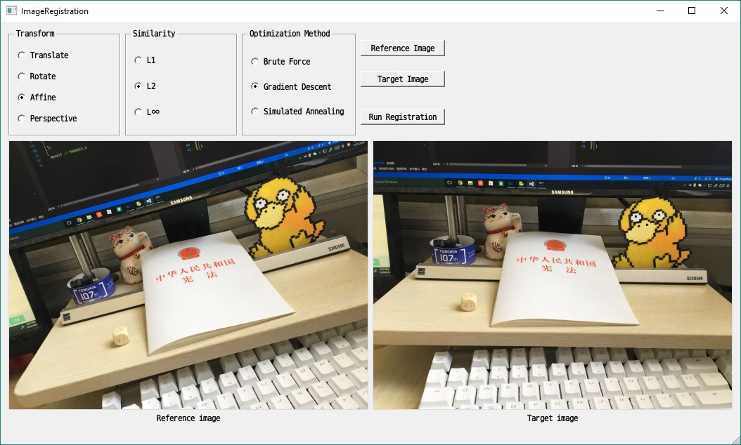 该工具能够将一幅图像进行变换,并与另一幅图像相匹配。支持包括平移、旋转(含平移、缩放)、仿射与透视共四 种变换,使用L1、L2、无穷范数作为优化的目标函数,实现了暴力算法、梯度下降法、模拟退火算法来求解该优化 问题。