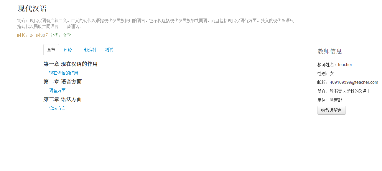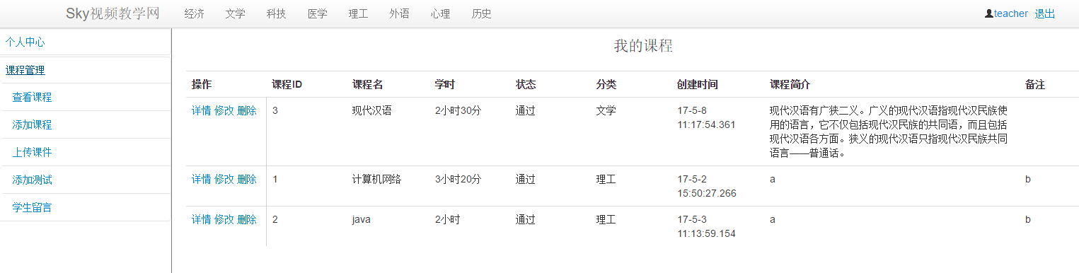 [Abstract] In the age of big data, we must keep up with the trend of the time instead of sticking to traditional classroom teaching. With the further development of the network, the online classroom has become the inevitable trend. In this essay, by using object-oriented design method, teachers can add courses and manage them, add tests, upload teaching courseware, and many other functions. Meanwhile, administrators can be set up to audit and manage the teachers and their video teaching courses. With front end using popular Bootstrap front frame to quickly build a page, the background uses the Struts2, Spring, Hibernate framework to implement video teaching platform, to achieve the purpose of the education resource sharing. Ultimately this achieves the basic functions of video teaching platform by using object-oriented design method and SSH framework.