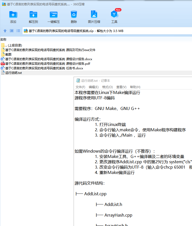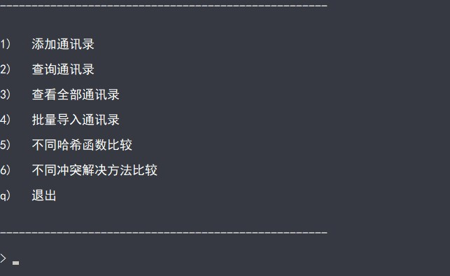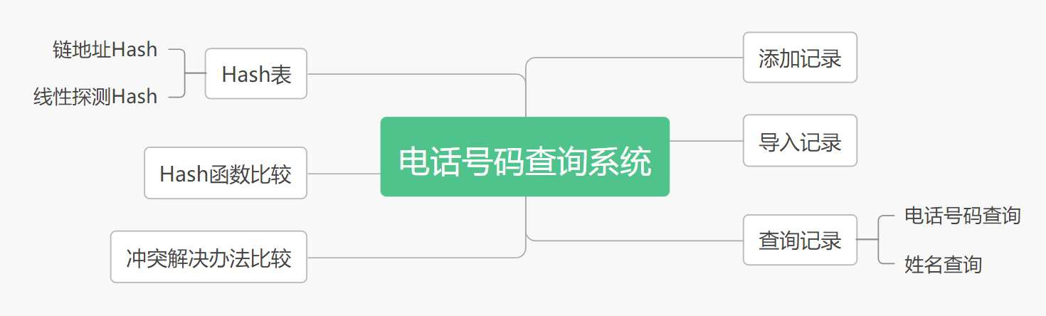 本系统为电话号码查找系统,本系统最频繁的操作为查询功能,查询速度的快慢对此系统有至关重要的影响,因此应该选择合适的数据结构来进行设计。散列表可以实现 O(1)的快速查找,用 Hash 数据结构作为底层存储结构较为合适。本系统应首先实现 Hash 表的基本结构和操作,在此基础上构建电话号码查找系统。电话号码查找系统包括若干数据项:电话号码、用户名、地址,可以键盘输入或文件批量导入记录,既可以使用电话号码作为索引建立 Hash 表,也可以使用姓名作为索引建立 Hash 表,并通过电话号码和姓名进行查找记录。更进一步, 在设计 Hash 数据结构时,可设计不同的 Hash 函数及采用不同的冲突解决算法, 来比较性能的差异。具体功能如下: