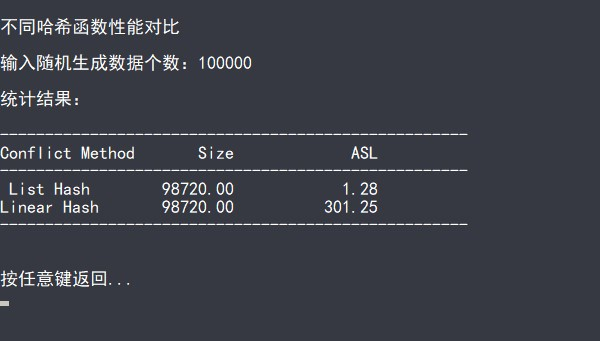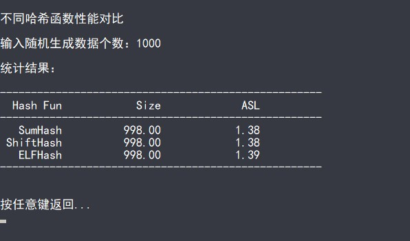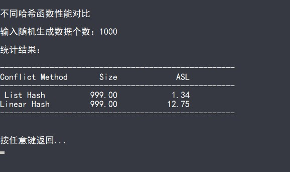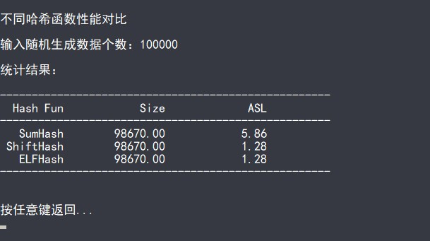 Hash 函数对字符串进行散列,设计不同的冲突解决策略,如链地址法、线性探测法等。Hash 表的结构由 key-value 组成,基本操作有添加元素、查找元素、删除元素、遍历元素、建表、销毁表等,并且设计可以计算平均查找长度(ASL)的函数,以此来比较不同的 Hash 函数使用相同的冲突解决算法,以及相同的 Hash 函数使用不同的冲突解决算法的优劣。为方便 Hash 表的使用,Hash 表可自动扩容。
