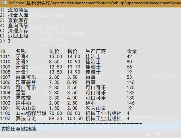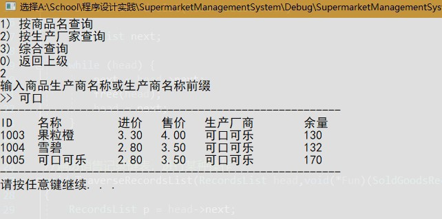 管理员和售货员可通过商品名称、商品生产商、名称和生产商的方式查询商品信息。管理员可获取全部商品信息(商品 ID、商品名称、进价、售价、生产厂商、余量),售货员可获取出进价以外的商品信息。查询可支持模糊查找、仅输入前缀。