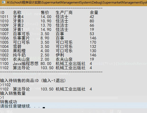 管理员和售货员可对库存内商品进行销售,对销售请求进行检查,销售后对库存相应商品的余量进行更新,同时记录销售的商品信息、销售时间,更新销售记录数据文件。