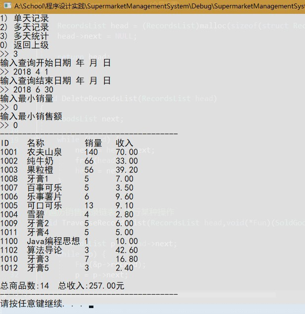 管理员可浏览某天的或日期区间内的所有销售记录,可对指定日期区间内的销售记录进行综合统计,统计每种商品的销量、收入,统计总收入,可通过销量、销售额筛选统计结果。