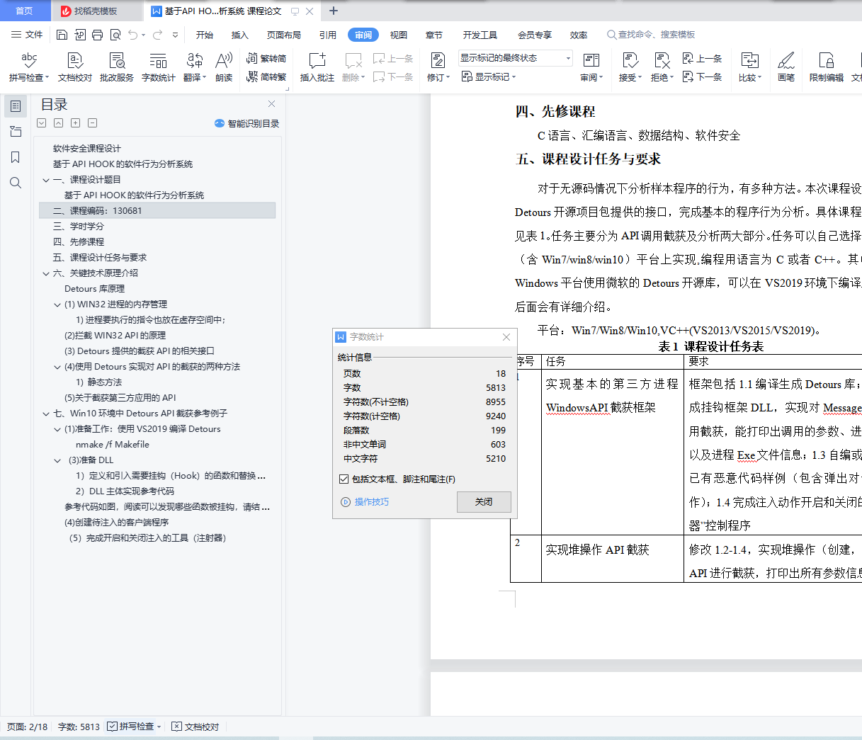 对于无源码情况下分析样本程序的行为,有多种方法。本次课程设计是利用Detours开源项目包提供的接口,完成基本的程序行为分析。具体课程设计任务见表1。任务主要分为API调用截获及分析两大部分。任务可以自己选择Windows(含Win7/win8/win10)平台上实现,编程用语言为C或者C++。其中使用的Windows平台使用微软的Detours开源库,可以在VS2019环境下编译后使用,后面会有详细介绍。
