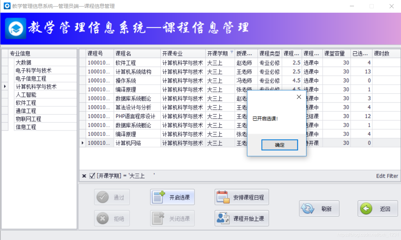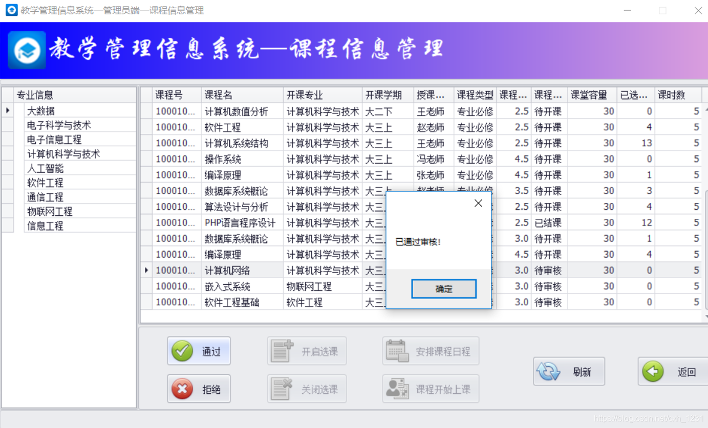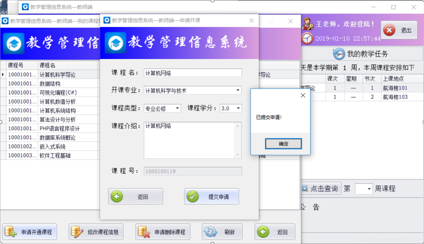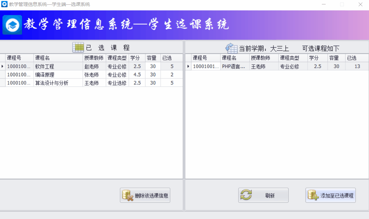 大学同时开设多门课程。每门课程有一个主讲教师,有多名学生选修;一个学生可选修多门课程并获得相应的学分和成绩;上课的基本单位是“次”(一次 2 学时),每一次课都规定了上课时间和教室(这一规定更灵活,并不像本校现在的情形!)。