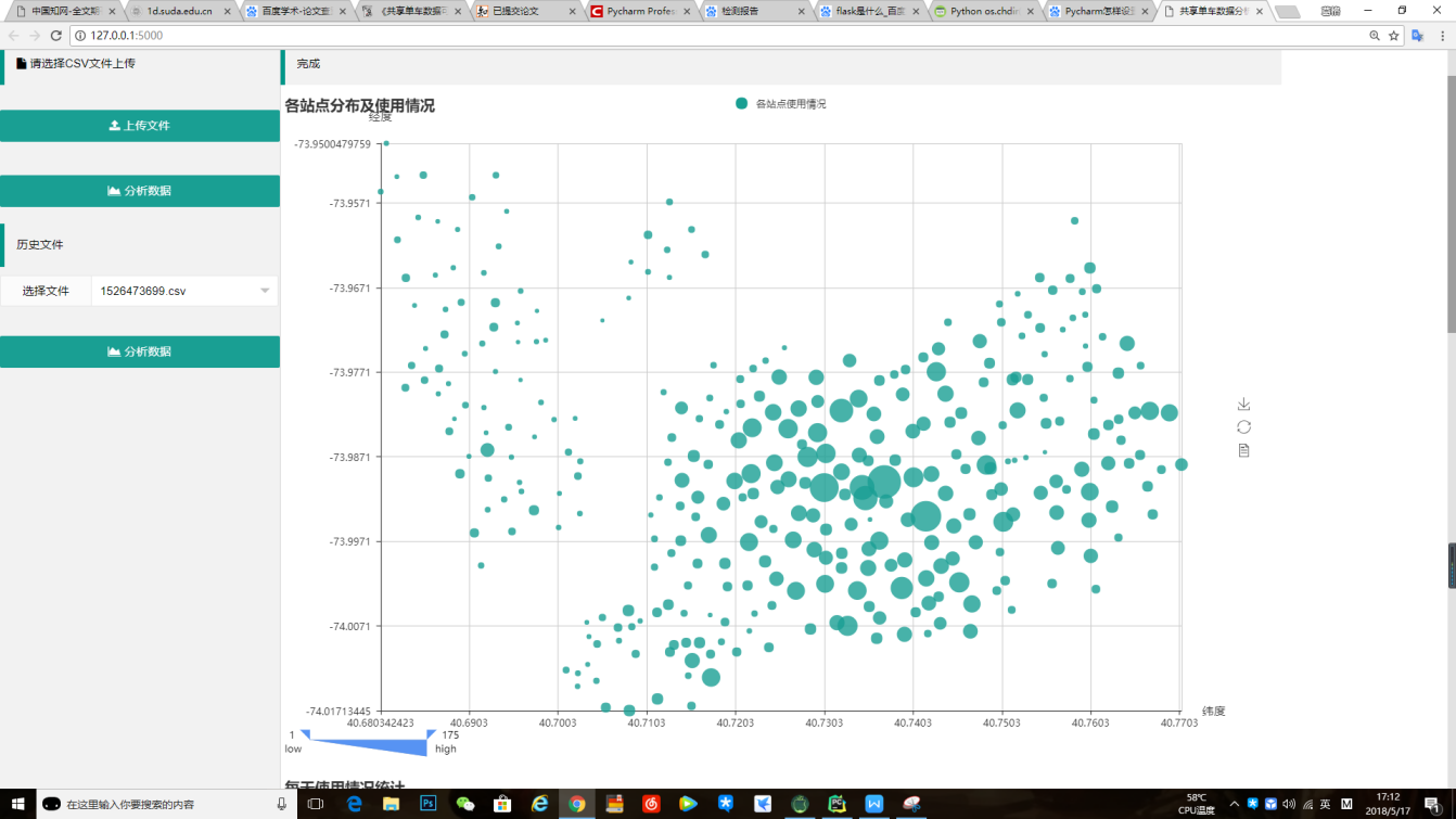 近年来,共享经济在我国进展迅速,收到了政府和广大民众的重大关注,而出现的很多问题也引起了众多学者的注意,关于共享单车的研究也越来越多。共享单车是指企业在校园、地铁站点、公交站点、居民区、商业区、公共服务区等提供自行车单车共享服务,是一种分时租赁模式。从共享单车数据中比如使用次数、骑行时间、骑行时长、起点和终点经纬度坐标等属性,我们可以看出人们的许多习惯从而进行研究。我们做一个数据可视化的系统要能做到文件上传,文件解析,文件数据可视化等功能,从而完成进一步分析。