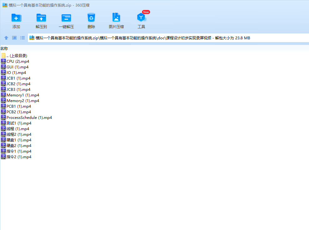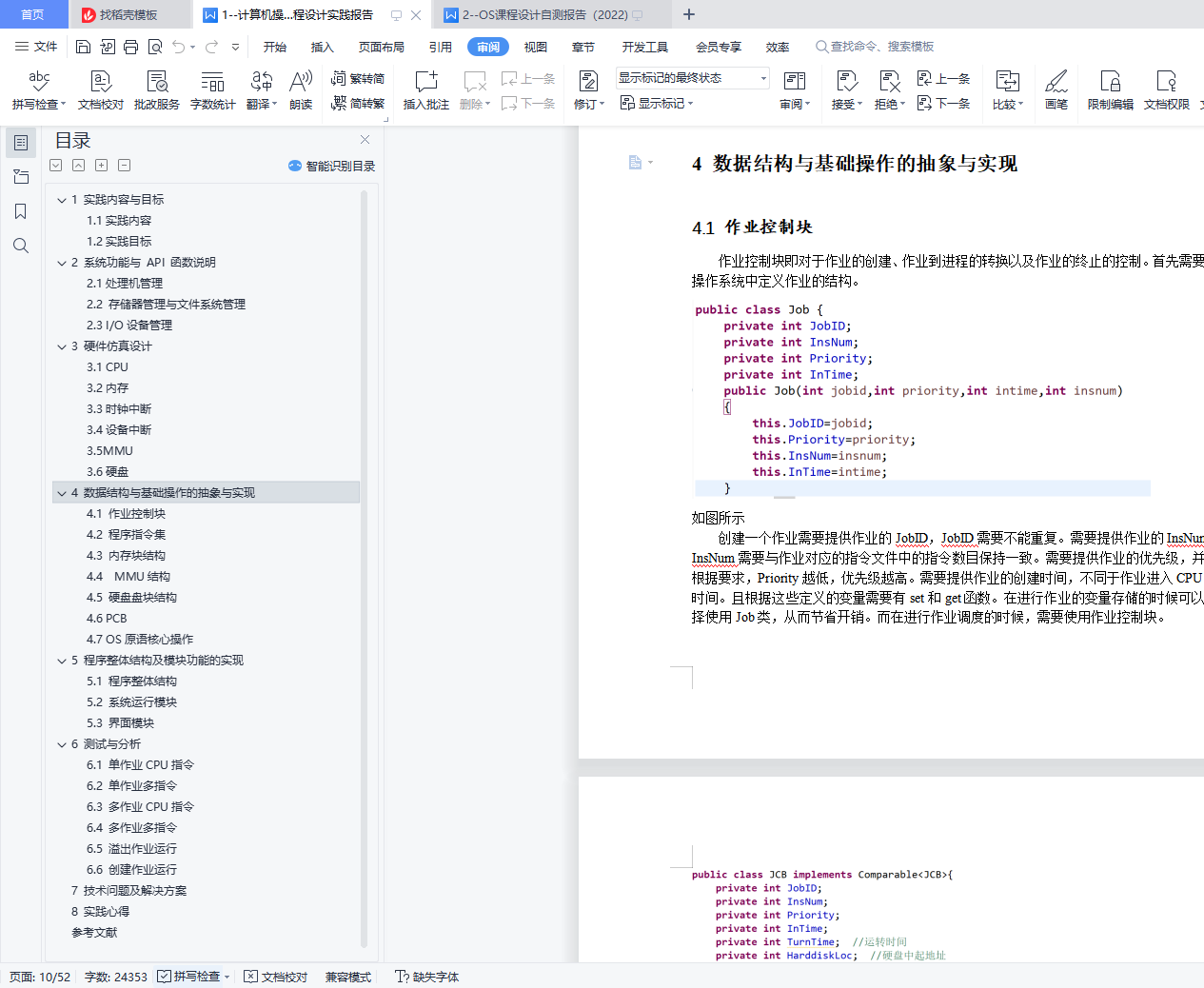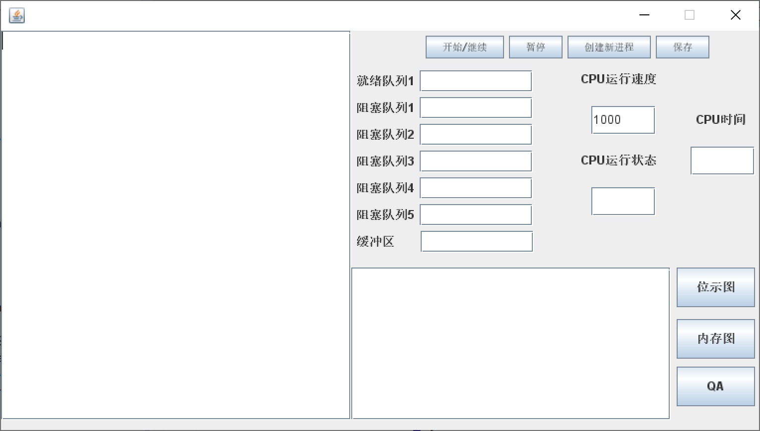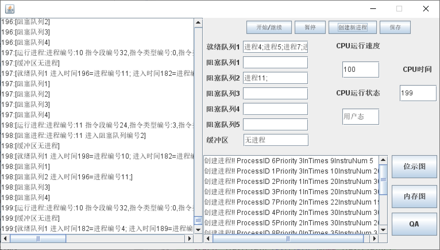 摘要:以计算机操作系统原理为指导,利用面向对象程序设计技术仿真 OS 内核的作业管理、 连续内存管理、页式虚存管理、进程同步与互斥、缓冲技术、磁盘管理和文件管理的 API 功 能,可视化显示操作系统工作过程,完成操作系统课程设计的程序设计、开发、测试,答辩 以及撰写实践报告。本时间选择了难度3,基础实现了基础设计硬件部分的仿真、作业管理、并发请求文件设计、用户程序段指令文件的设计、作业运行及操作系统运行详细记录的文件的保存、进程控制块PCB设计。实现了作业并发环境下,MMU 地址变换、作业调度算法、进程原语、优先级+时间片轮转进程调度算法,位示图法实现连续空间动态分配管理。并把连续空间分配过程可视化实现。我定义的PCB和JCB和其他在定义的时候并没有很多变量,这都是因为我考虑不周,发现在实现函数的时候才需要更多的变量来存储一些值。比如这次实验需要实现指令运行自定义时间,就需要定义一个变量,存储进程每条指令的已运行时间,然后再把这个运行时间与既定的运行时间相比较,如果满足条件才能指向下一条指令。而对于内存地址来说,一个进程在创建后才有内存空间,但是内存地址由于内存申请在前不好传递给进程,则需要在进程中重新定义一个内存起地址变量。