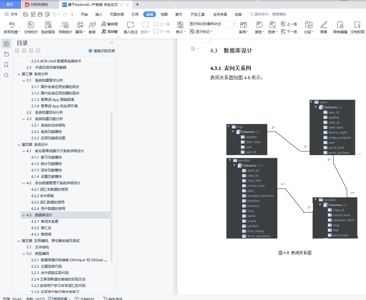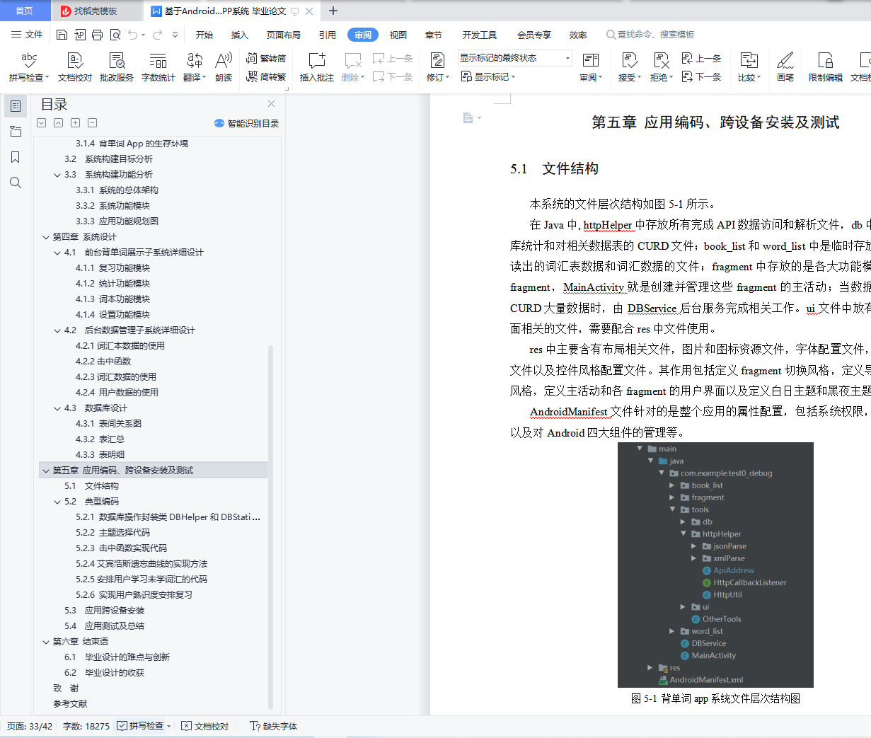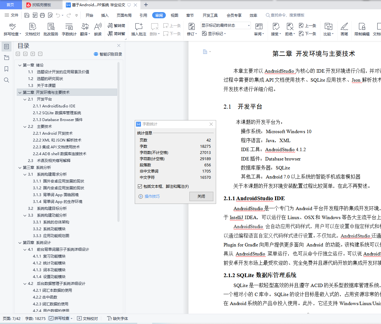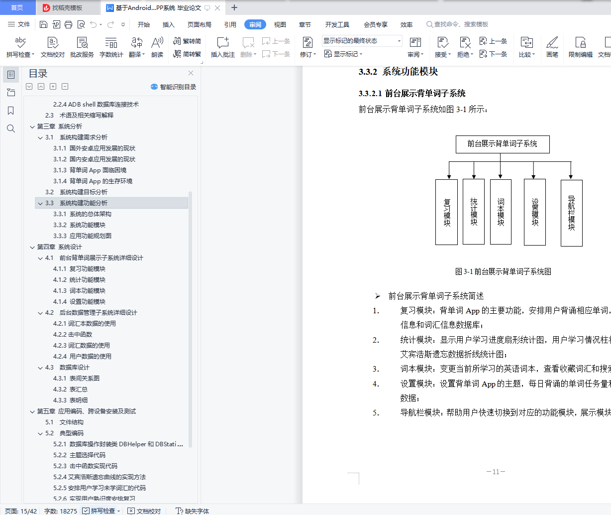 毕业设计说明书(论文)中文摘要Android是一种广泛流行的操作系统,在Android应用市场中每天都有上万个应用程序安装包投入使用。Android的问世极大地满足了人们追求方便的需要,不仅推动了当代智能手机多样性和多功能性发展,还将生活中的各种办公功能、娱乐功能和实用功能等结合起来,因此广受人们的喜爱。本课题的研究旨在通过词库的解析与导入,统计个人背诵信息以简化单词背诵流程并优化单词背诵方式,节约时间成本,追求学习工具便携化和单词学习效率最大化。本应用是基于Android操作系统开发一个单词背诵手机客户端软件,能够结合不同用户的遗忘数据并反映为相应的遗忘曲线,从而达到更加有效地帮助用户记忆单词的目的。本应用具备学习任务量管理、学习内容设置、学习情况查询、遗忘曲线计算和统计以及单词查询(通过API实现)等功能。系统采用SQLite数据库来存用户信息,词汇本信息,词汇信息和用户学习数据信息等。本文重点介绍了背单词应用的功能实现方法以及关键技术。关键字 背单词应用 遗忘曲线 Android SQLite API毕业设计说明书(论文)外文摘要Title Design and development of word memorizing systembased on AndroidAbstractAndroid is a popular operating system. In the Android application market, tens of thousands of application packages are put into use every day. The advent of Android greatly meets the needs of people's pursuit of convenience, not only promotes the diversity and multi-functional development of contemporary smart phones, but also combines various office functions, entertainment functions and practical functions in life, so it is widely loved by people. The purpose of this research is to simplify the process of word recitation and optimize the way of word recitation by analyzing and importing the personal recitation information, saving time and cost, and pursuing the portable learning tools and maximizing the efficiency of word learning.This application is based on Android operating system to develop a word recitation mobile phone client software, which can combine the forgetting data of different users and reflect it as the corresponding forgetting curve, so as to achieve the purpose of more effectively helping users memorize words. This application has the functions of learning task management, learning content setting, learning situation query, forgetting curve calculation and statistics, and word query (realized through API). The system uses SQLite database to store user information, vocabulary information, vocabulary information and user learning data information.This paper focuses on the function realization method and key technology of memorizing word applicationThis paper focuses on the function realization method and key technology of memorizing word application.Keywords Application of memorizing words, Forgetting curve, SQLite, Android, API目 录第一章 绪论 11.1 选题设计开发的应用背景及价值 11.2 选题的研究现状 11.3 关于本课题 2第二章 开发环境与主要技术 32.1 开发平台 32.2 主要技术 42.3 术语及相关缩写解释 7第三章 系统分析 83.1 系统构建需求分析 83.2 系统构建目标分析 103.3 系统构建功能分析 10第四章 系统设计 144.1 前台背单词展示子系统详细设计 144.2 后台数据管理子系统详细设计 224.3 数据库设计 26第五章 应用编码、跨设备安装及测试 295.1 文件结构 295.2 典型编码 305.3 应用跨设备安装 355.4 应用测试及总结 35第六章 结束语 376.1 毕业设计的难点与创新 376.2 毕业设计的收获 37致 谢 38参考文献 39