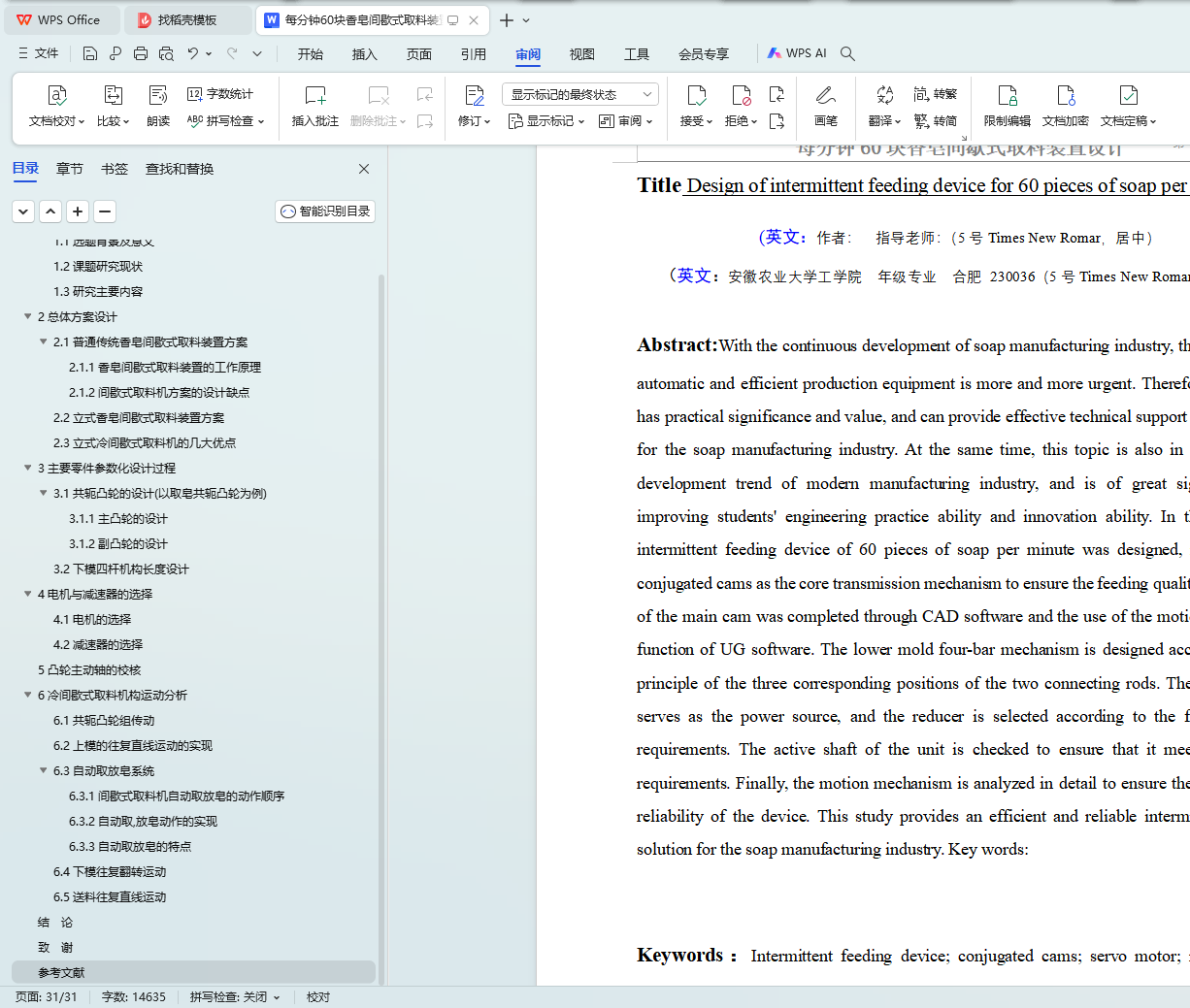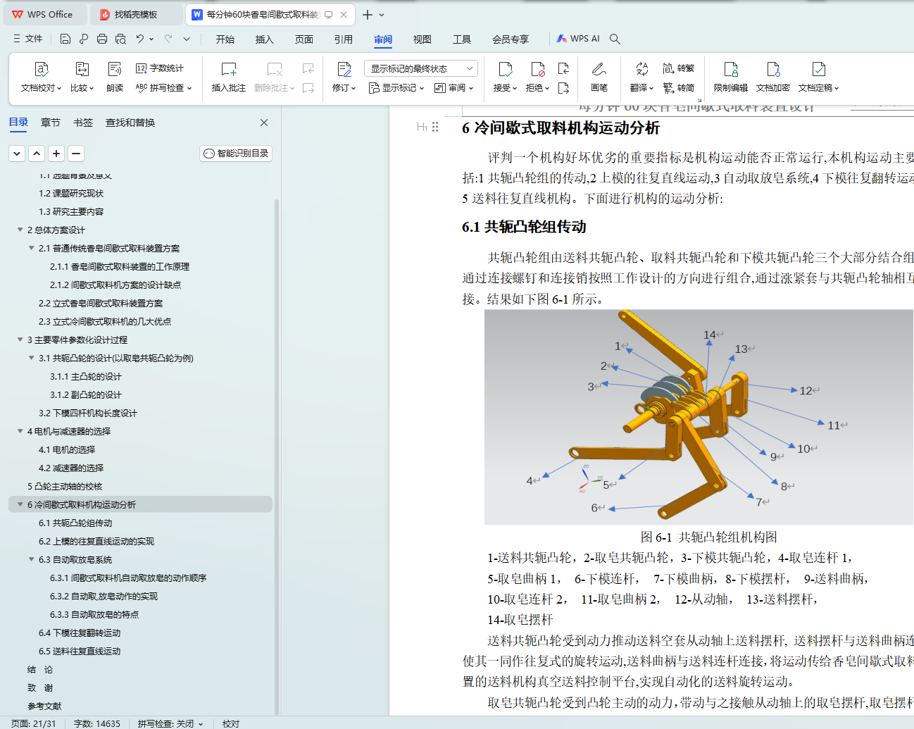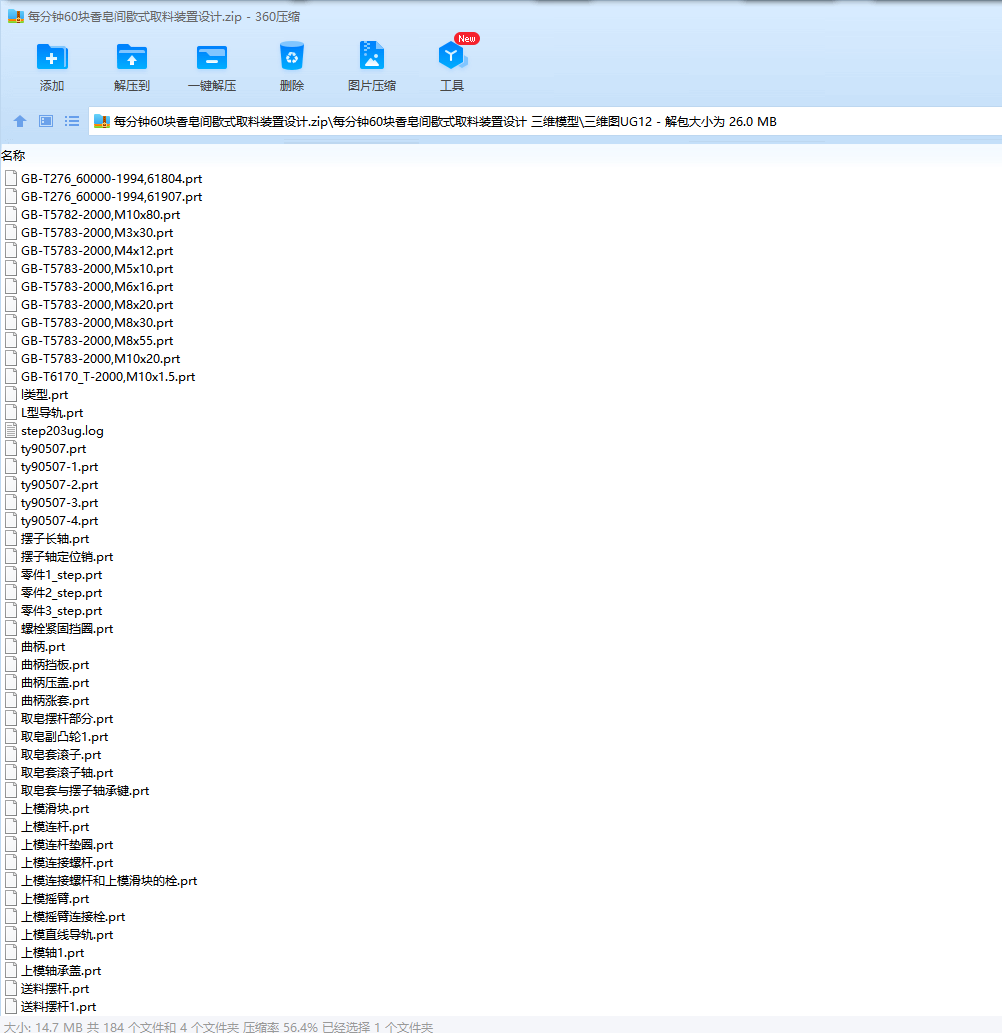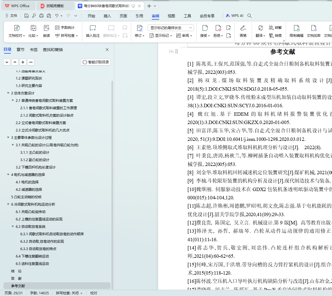 随着香皂生产行业的持续进步,业界对于自动化程度高、生产效率高的机械装备的需求量日益增加。鉴于此,本研究主题不仅具有现实的应用价值,而且对于推动香皂制造业的技术进步具有显著意义。此外,本研究选题与当代制造业的发展方向相契合,对于增强学生的工程实操技能和创新思维能力同样具有积极的促进作用。在本项研究中,我们设计了一种新型的间歇式取料设备,该设备的设计产能达到每分钟60块香皂,其核心传动系统采用了共轭凸轮机构,以保障取料的精准度。利用计算机辅助设计(CAD)软件,我们完成了主凸轮的详细设计,同时借助UG软件的运动仿真特性,完成了副凸轮的设计工作。下模的四杆机构设计遵循了两连杆机构的三个对应位置原理。伺服电机作为整个设备的动力输入源,而减速器的选型则基于取料速度的具体要求。对设备主动轴的校核工作也已完成,以保证其能够满足生产的实际需求。最终,我们对整个运动机构进行了细致的分析,以确保所设计装置的稳定性与可靠性。通过本研究,我们为香皂制造业提供了一套高效且可信赖的间歇式取料解决方案。
