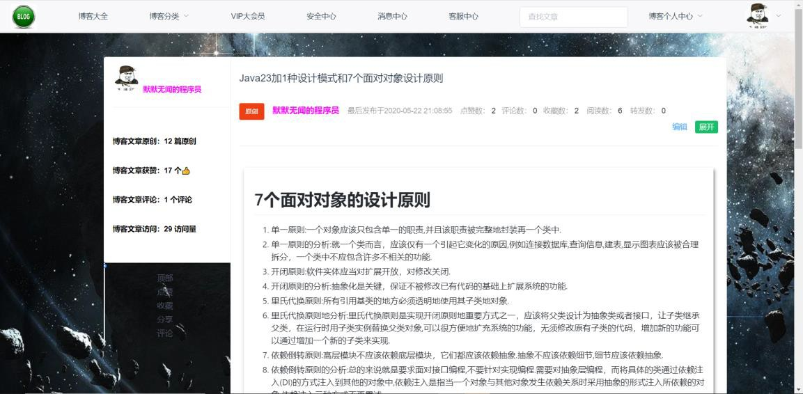 博客是用来分享自己的心情和动态拉近人与人之间的距离,它改变了人们的在网上的交流方式,也增强了互联网的趣味性。 “微服务”是最近两年开始流行起来,但是其实早在20年前都有专家提出过,只不过当时的用户量并不像现在那么高。例如:一个系统的功能越丰富就会导致技术债务越多,但是基于单体应用(一个war包)开发的代码库越来越臃肿,可维护性差,代码“不坏不修”。为此,引入“微服务”架构的方式可以改善这个状况,每个微服务中心均在独立的进程中负责每种功能的业务,由一系列独立运行的微服务中心共同构建整个系统。现在web的前后端分离是企业的一种趋势,前后端分离同样也是技术创新的一种体现。得益于开发分离的趋势,Vue与SpringCloud的组合方式在如今的Web网站开发中占据重要的位置。