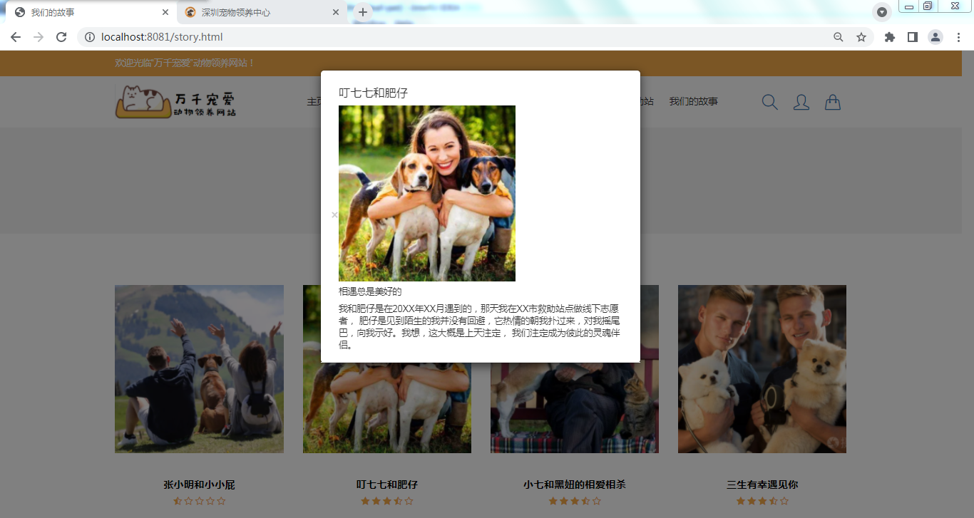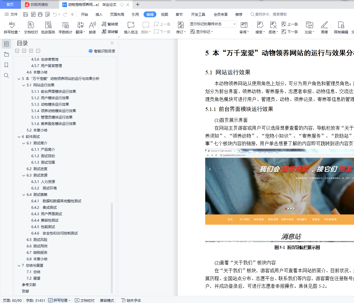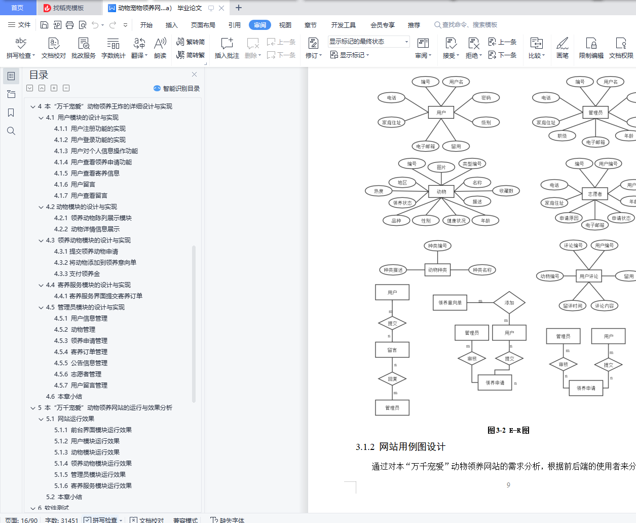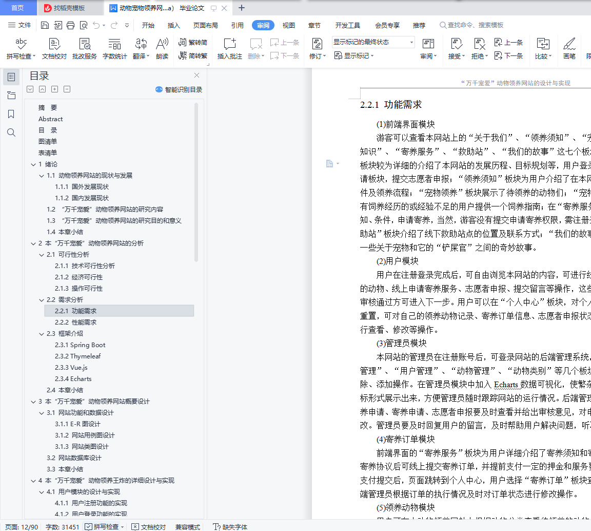 摘 要据公开数据显示,我国流浪动物总量近5000万只,数量庞大且呈现逐年增加的态势,饥饿、被虐待、疾病等悲剧围绕着它们。且流浪动物泛滥给公民自身安全、社会及生态环境等方面都带来了许多不良影响,由此,一些省市地方政府为解决流浪动物泛滥影响公民生活的问题,决定成立动物救助站,也有公民自发自愿成立救助团队。受地理区域的限制、资金不足、救助工作宣传困难等问题,流浪动物的救助、领养工作进展缓慢。随着互联网的迅猛发展,尤其是电子商务快速普及,为动物领养、助养的普及与发展提供了良好的条件。虽然已有一部分人率先搭上互联网的顺风车,建立相关动物救助、领养、助养的网站,但是因信息更新不及时、地域限制、人力物力匮乏等问题,且救助站内存在动物泛滥、资金紧缺的情况,不能形成一个良性的循环。本“万千宠爱”动物领养网站利用Web浏览器和客户端浏览器的网络高效率、低成本、及时更新的特点,致力于为真心喜爱动物的人提供便捷安全的领养平台,在减轻流浪动物带来的不良影响的同时,能够帮助它们找到新家,重获新生。该论文有图44幅,表25个,参考文献13篇。关键词:动物 领养 流浪 救助Design and implementation of thousands of pet animaladoption websiteAbstractAccording to public data, the total number of stray animals in China is nearly 50 million, which is huge and increasing year by year. Tragedies such as hunger, abuse and disease surround them. Moreover, the proliferation of stray animals has brought many adverse effects on citizens' own safety, society and ecological environment. Therefore, in order to solve the problems that the proliferation of stray animals affects citizens' life, some provincial and municipal local governments decided to establish animal rescue stations, and some citizens volunteered to establish rescue teams. Due to geographical constraints, lack of funds and difficulties in publicity of rescue work, the rescue and adoption of stray animals have made slow progress.With the rapid development of the Internet, especially the rapid popularization of e-commerce, it provides good conditions for the popularization and development of animal adoption and assistance. Although some people have taken the lead in taking the ride of the Internet to establish websites for animal rescue, adoption and support, a virtuous circle cannot be formed due to the problems of untimely information update, geographical restrictions, lack of human and material resources, and the proliferation of animals and shortage of funds in the rescue station.Using the characteristics of high efficiency, low cost and timely update of web browser and client browser, this "thousands of favorite" animal adoption website is committed to providing a convenient and safe adoption platform for people who really love animals. While reducing the adverse effects of stray animals, it can help them find a new home and regain their rebirth.There are 44 figures, 25 tables and 13 references in this paper.Key Words: Animals Adopt Stray Rescue目 录摘 要 IAbstract II目 录 III图清单 V表清单 VII1 绪论 11.1 动物领养网站的现状与发展 11.2 “万千宠爱”动物领养网站的研究内容 21.3 “万千宠爱”动物领养网站的研究目的和意义 21.4 本章小结 32 本“万千宠爱”动物领养网站的分析 42.1 可行性分析 42.2 需求分析 42.3 框架介绍 62.4 本章小结 73 本“万千宠爱”动物领养网站的概要设计 83.1 网站功能和数据设计 83.2 网站数据库设计 223.3 本章小结 264 本“万千宠爱”动物领养网站的详细设计与实现 274.1 用户模块的设计与实现 274.2 动物模块的设计与实现 364.3 领养动物模块的设计与实现 384.4 寄养服务模块的设计与实现 424.5 管理员模块的设计与实现 434.6 本章小结 525 本“万千宠爱”动物领养网站的运行与效果分析 535.1 网站运行效果 535.2 本章小结 686 软件测试 696.1 测试简介 696.2 测试进度 716.3 测试资源 716.4 测试策略 726.5 测试风险 746.6 测试用例 746.7 缺陷报告 796.8 本章小结 797 总结与展望 807.1 总结 807.2 展望 80参考文献 82致谢 83
